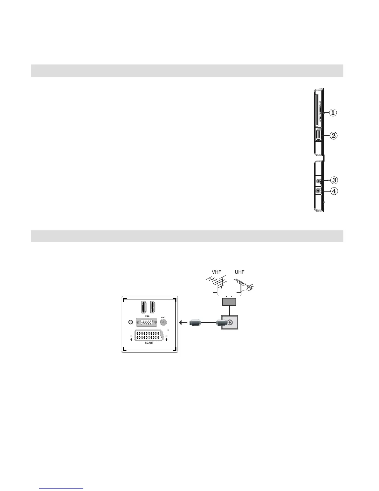 Connect the aerial to the • AERIAL INPUT (ANT) socket located at the rear of the TV.