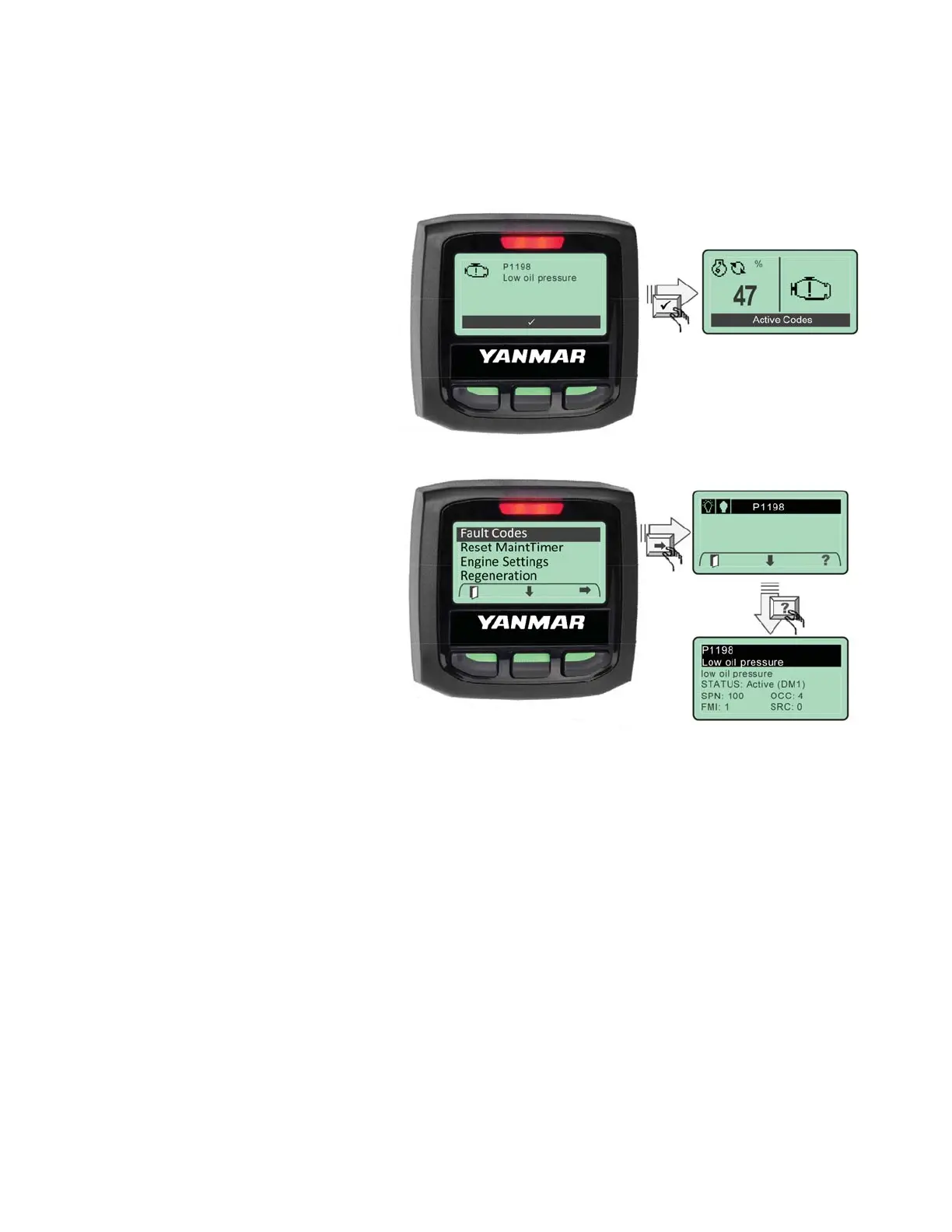Engine fault codes (active and stored) are generated by the engine ECU and communicated to