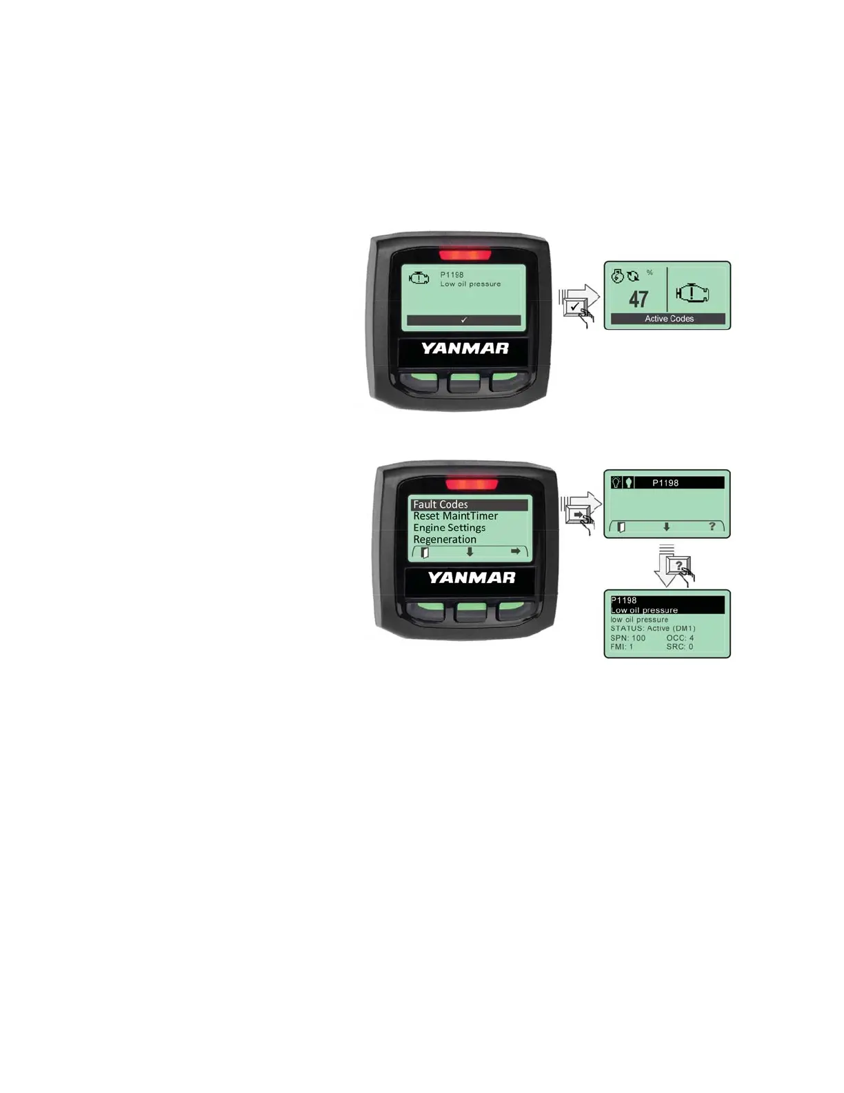Engine fault codes (active and stored) are generated by the engine ECU and communicated to