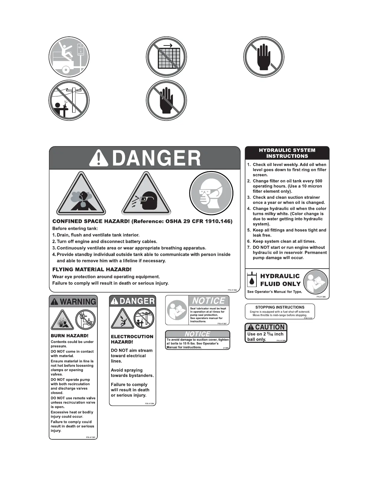 Finn T75 HydroSeeder - Additional Safety Decals and Hazards; Confined Space and Flying Material Hazards; Hydraulic System Safety Instructions