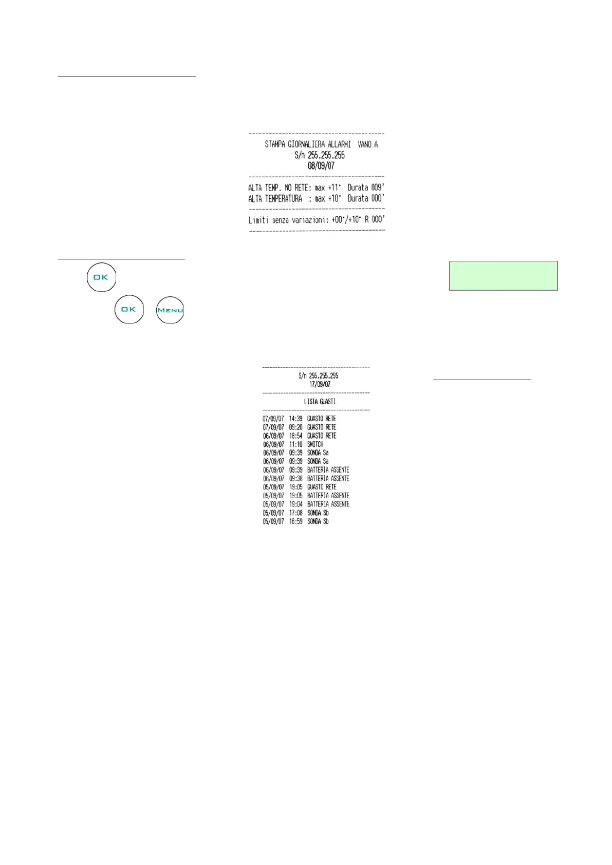 Every day, only when alarms are detected, a daily alarm report is printed. The report shows the type of alarm, the