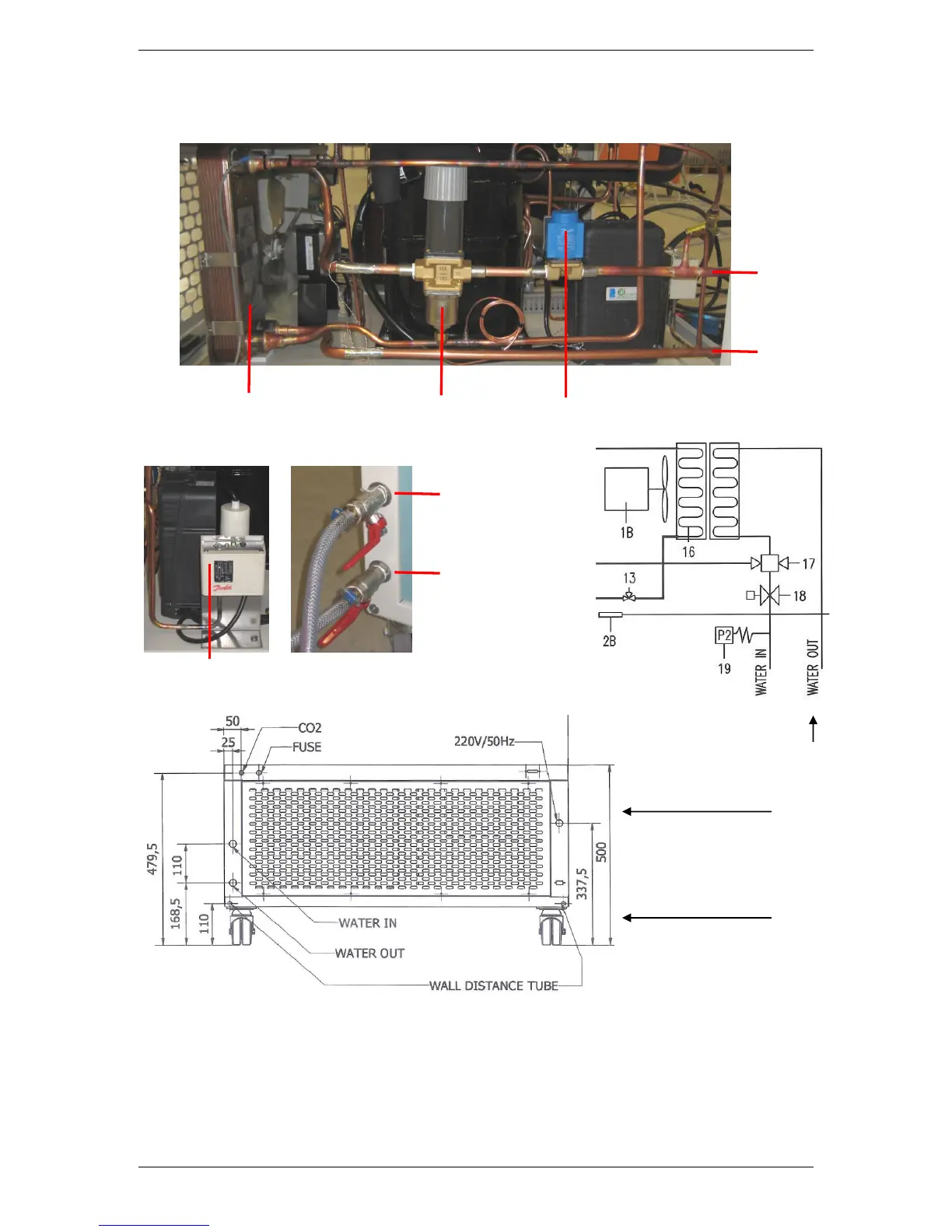 Pressure pressostat (2) Water in- & outlet (1)