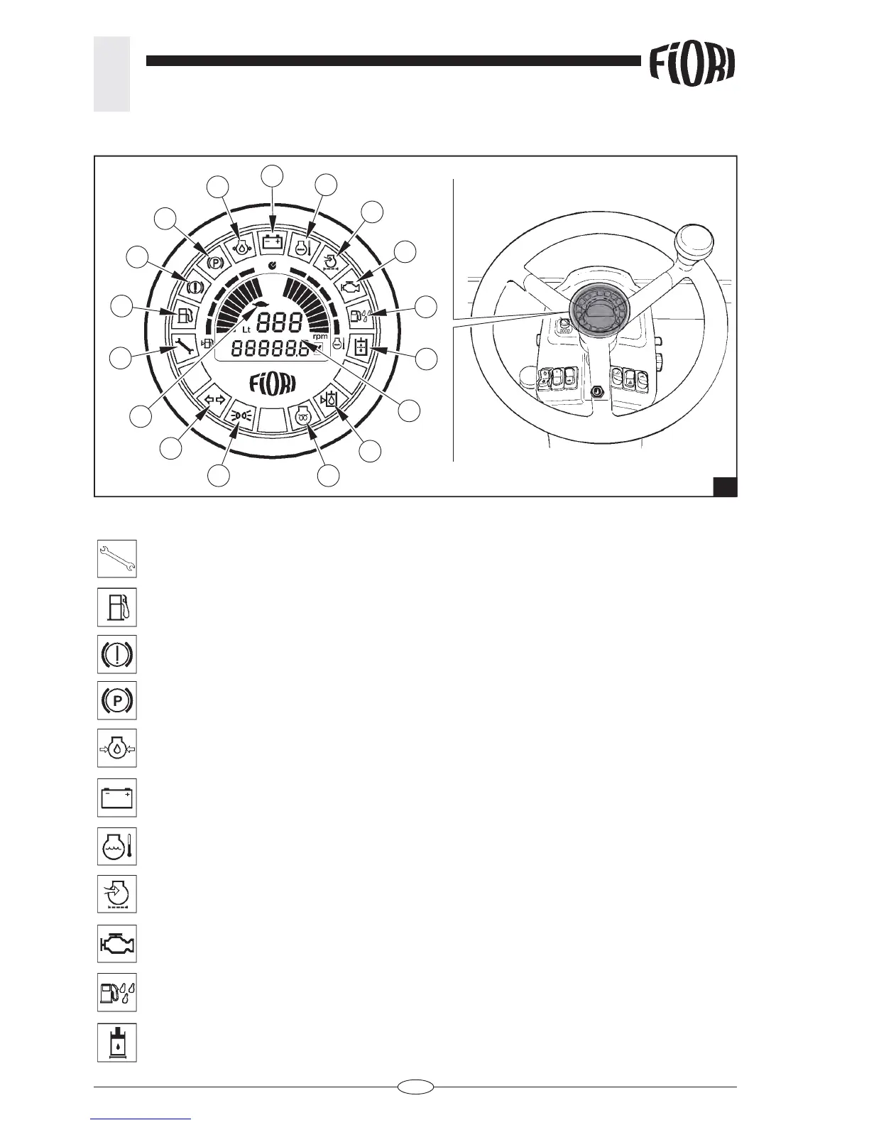 11 - Red warning light: indicates that the hydraulic oil fi lter is clogged.