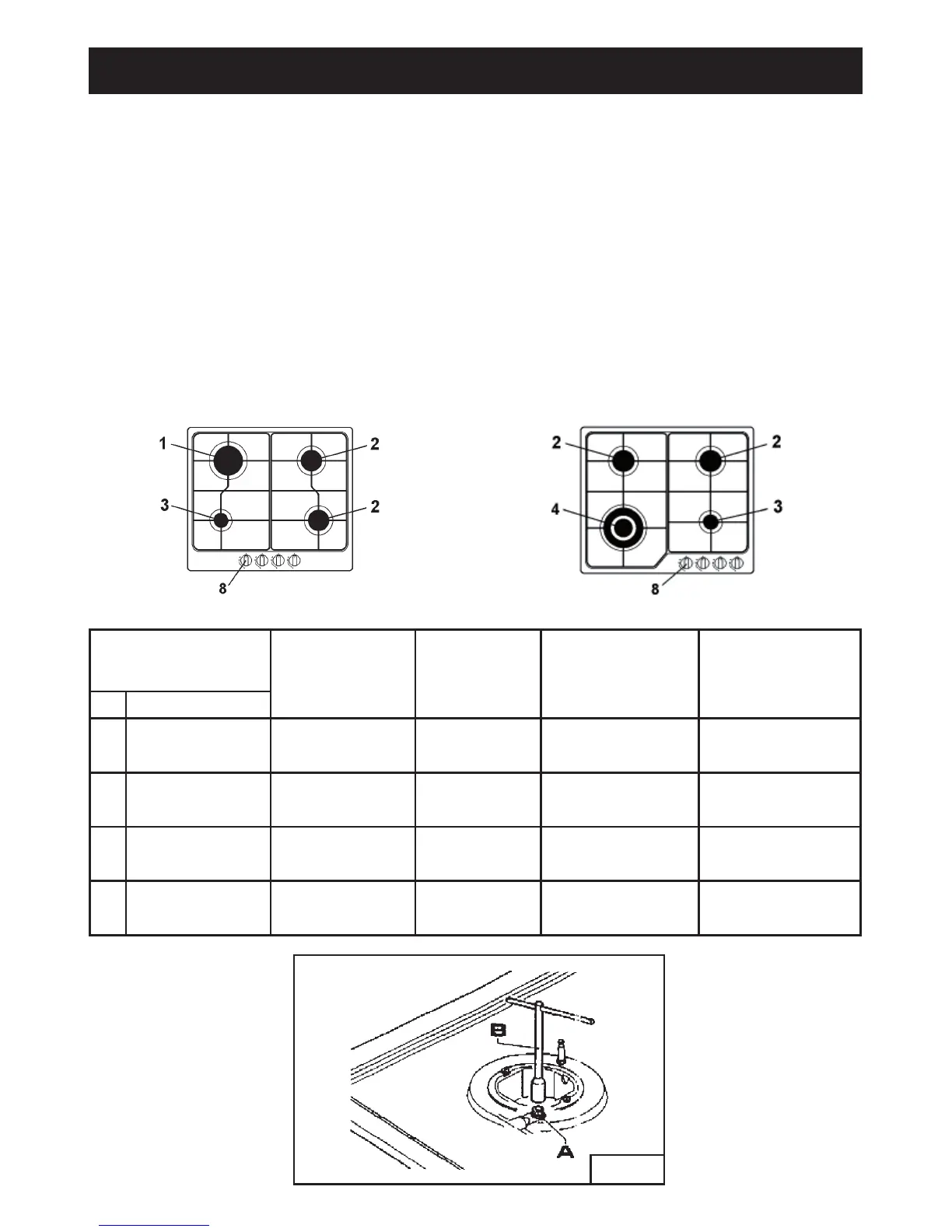 required. To do this, first remove the burner tops using a wrench “B”. Now unscrew injector “A” (see fig.