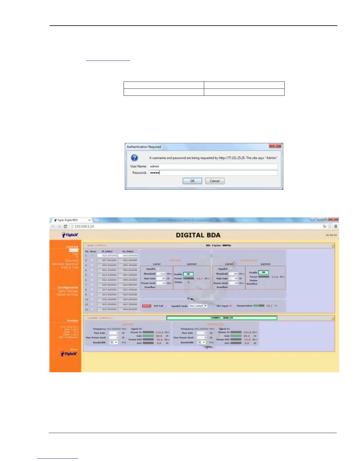 After authentication, web browser will load the main page of Fiplex Signal Booster showing RF