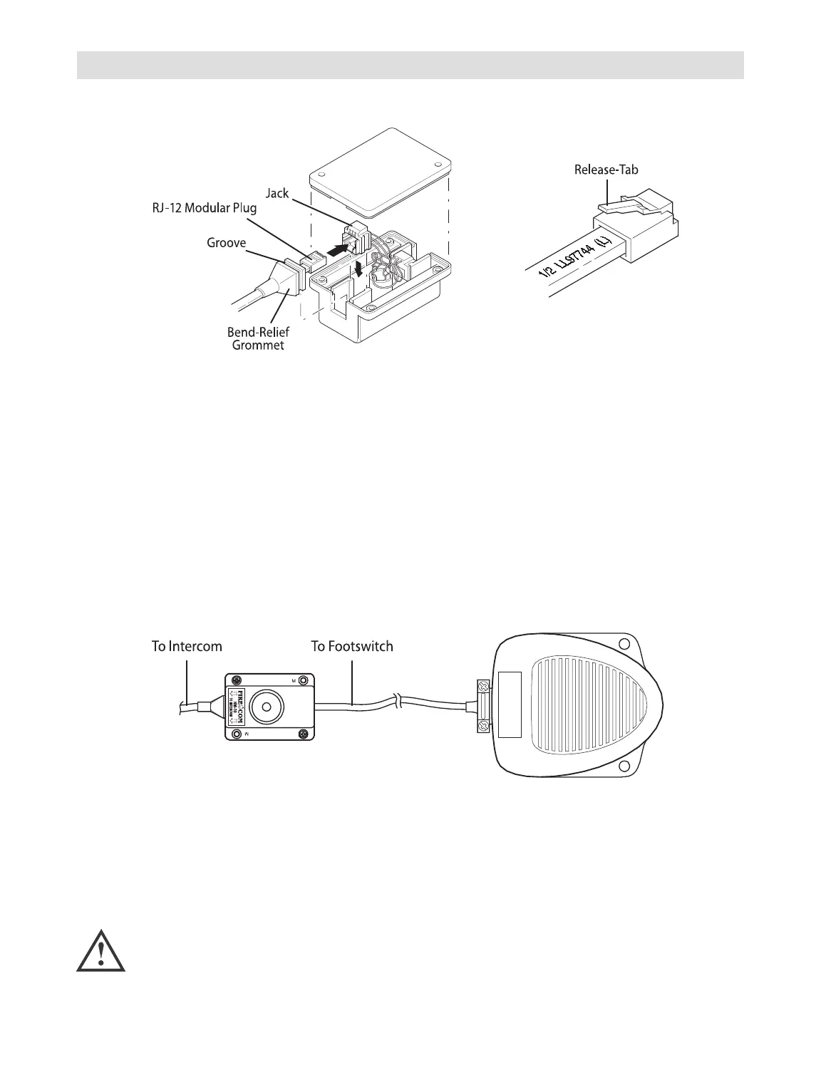 The foot switch is installed to the headset module using a CA cable and RJ-12 connector. You will need to open