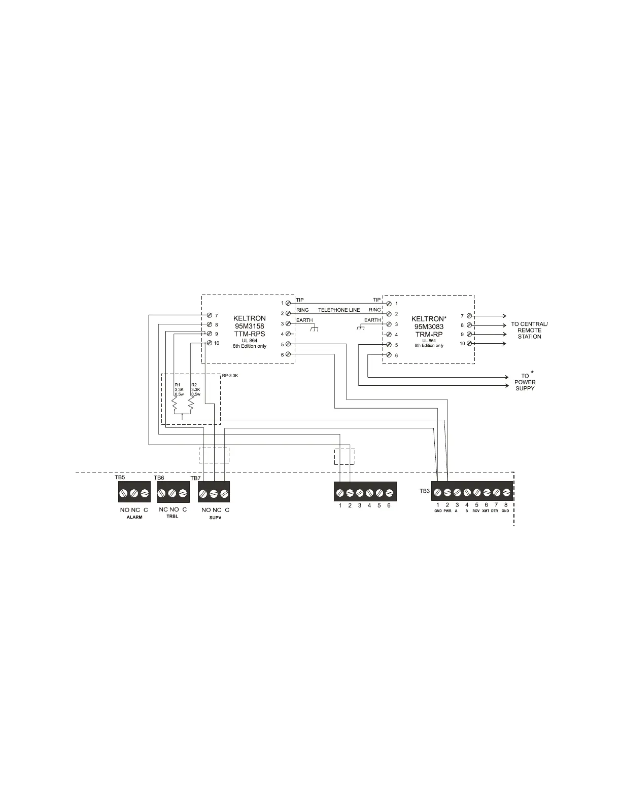 1. Terminals 7 and 8: Remote station alarm/trouble inputs.