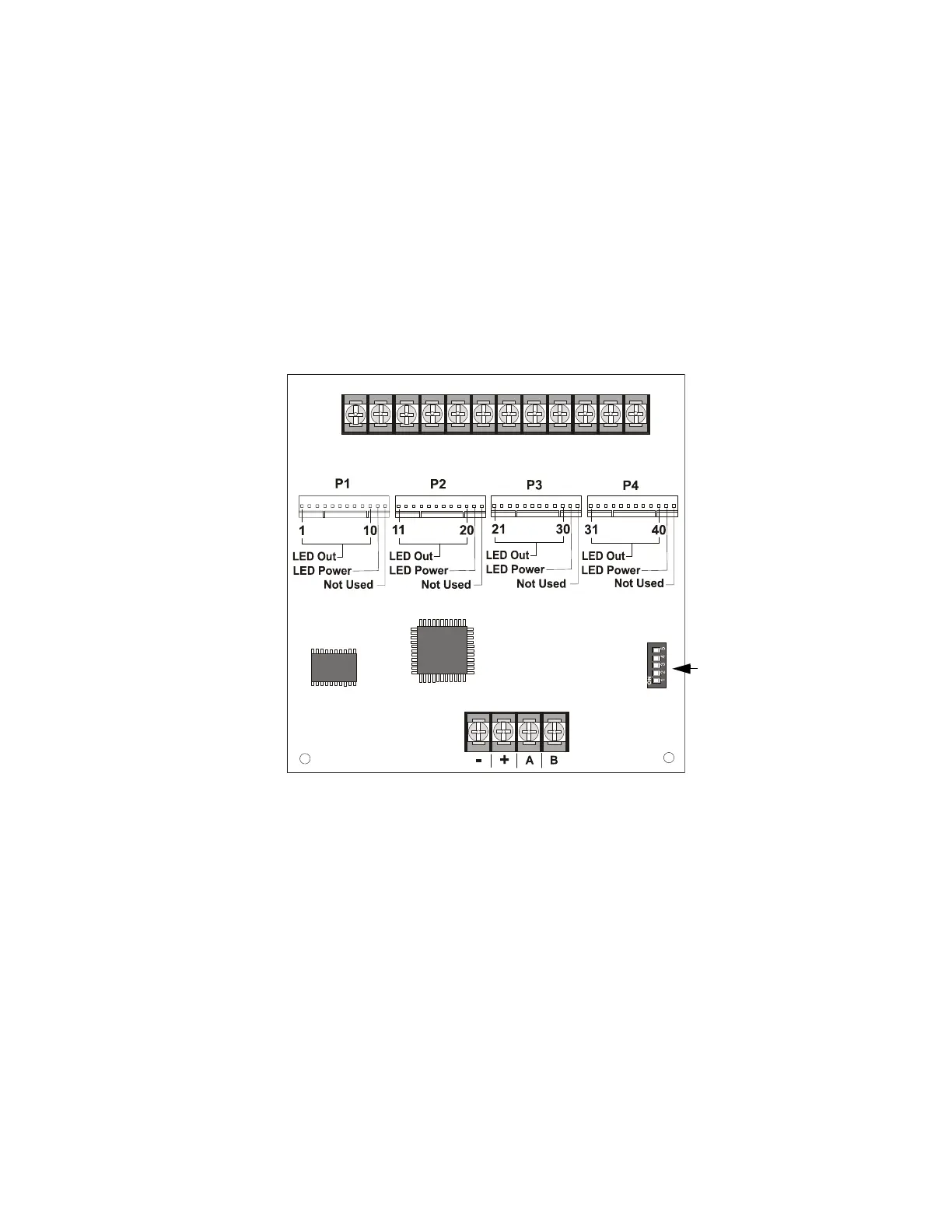 to the FACP, pin connectors for connecting LEDs and the DIP switch for selecting the ANN-