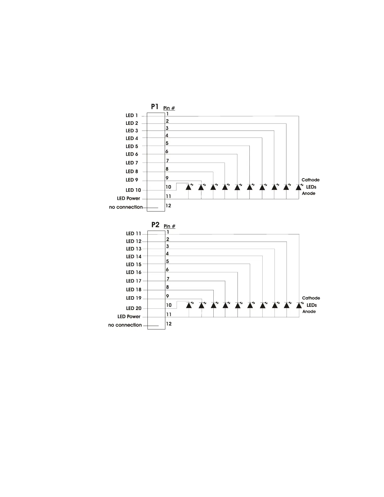connectors P1 and P2. Wiring is identical for P3 (LEDs 21-30) and P4 (LEDs 31-40).