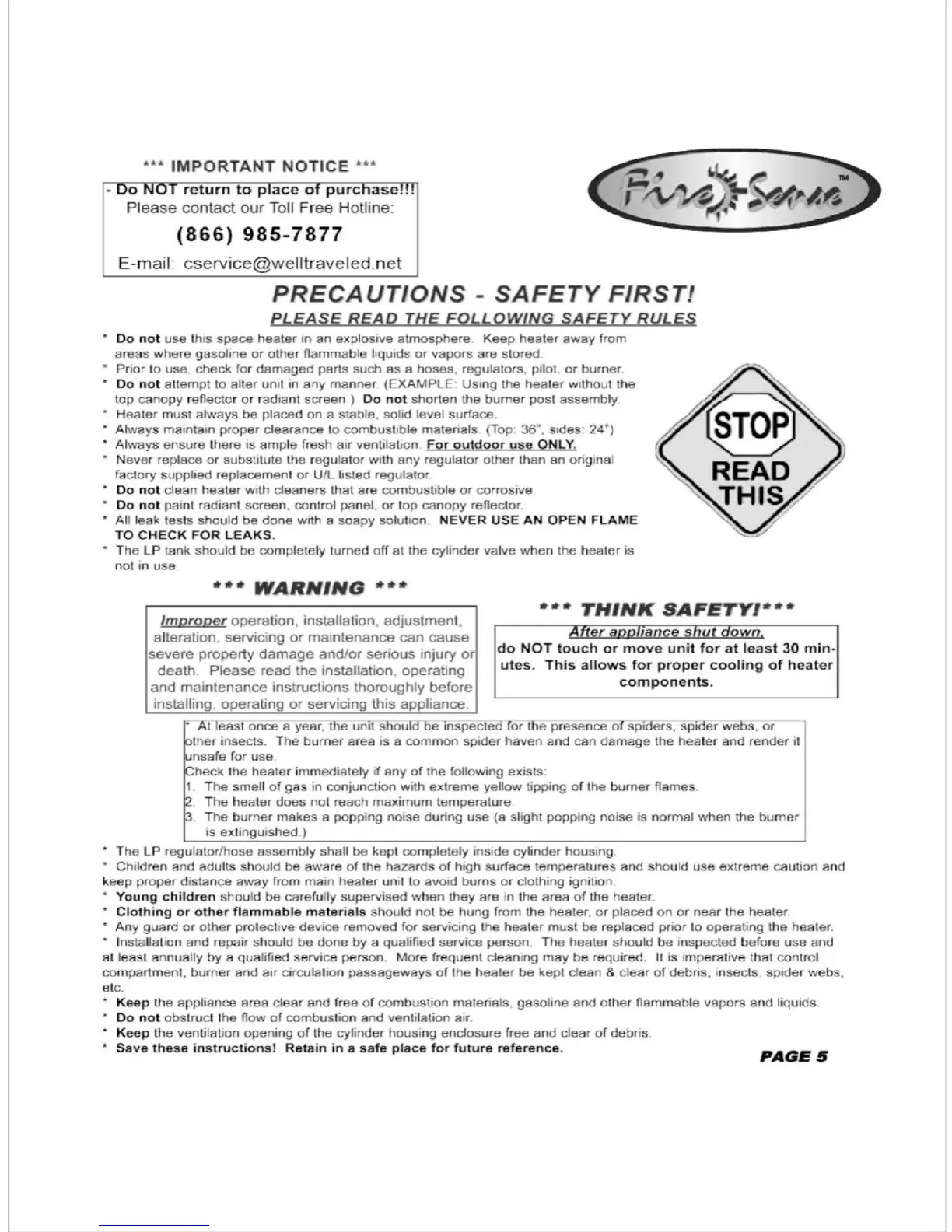 Fire Sense LTCSPH-SS - Precautions