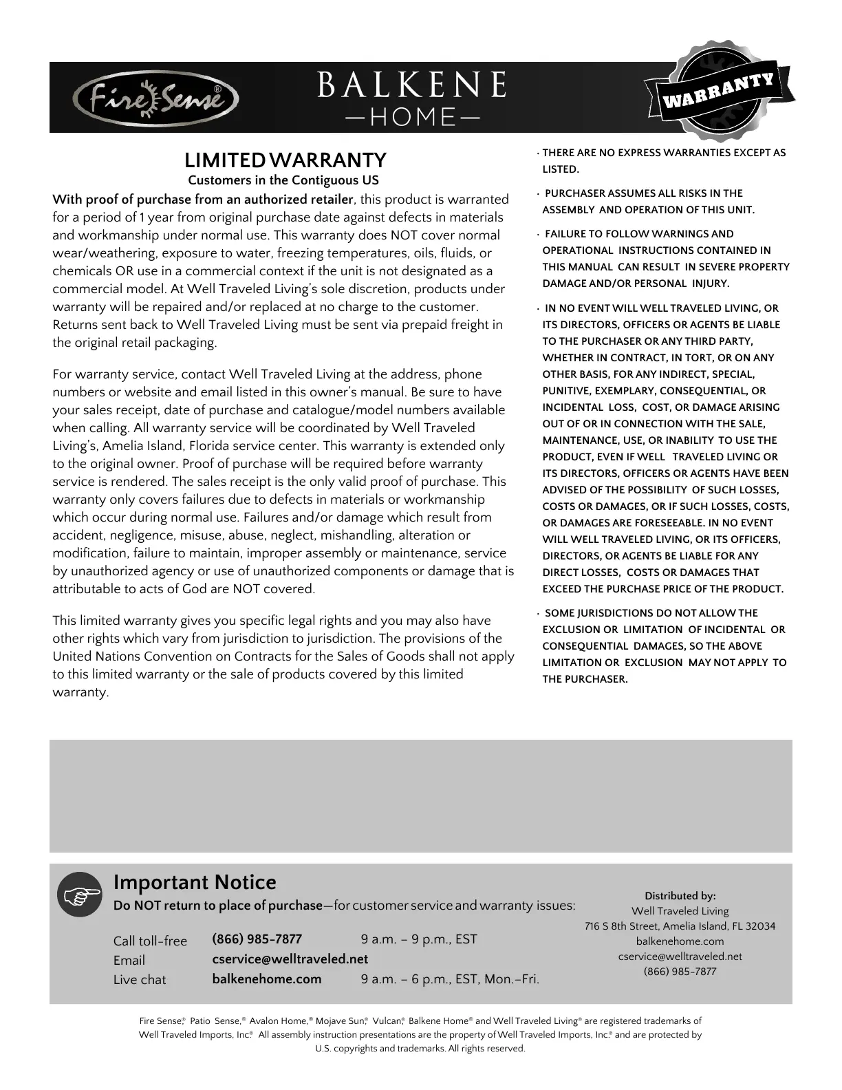 For warranty service, contact Well Traveled Living at the address, phone