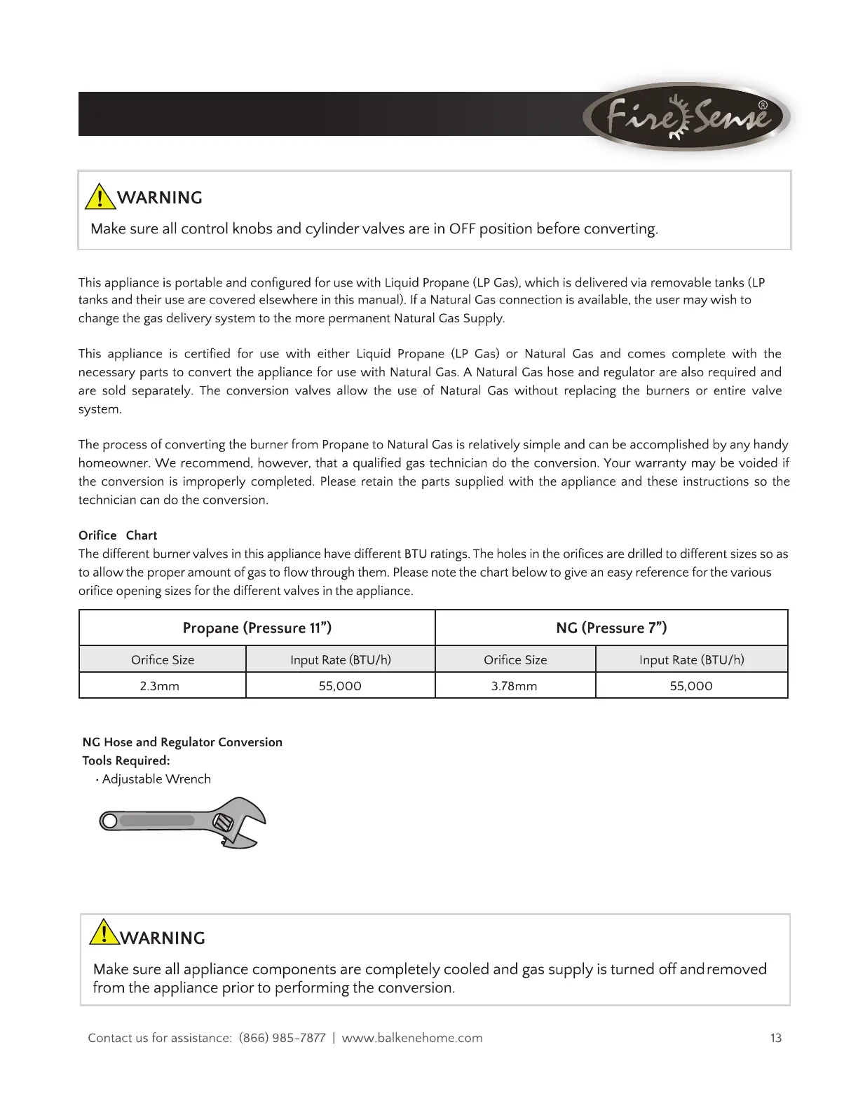 Firesense 63695 - Conversion to Natural Gas; Orifice Specifications; Conversion Tools Required