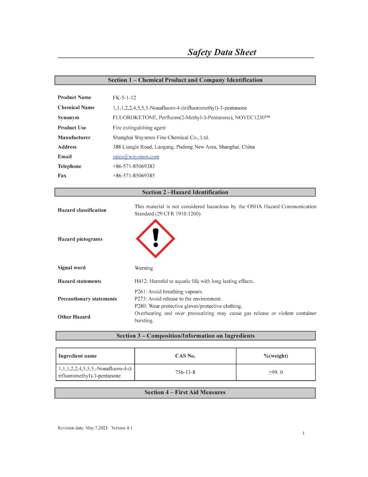FIRETRACE FK-5-1-12 - Appendix E - Safety Data Sheet Waysmos