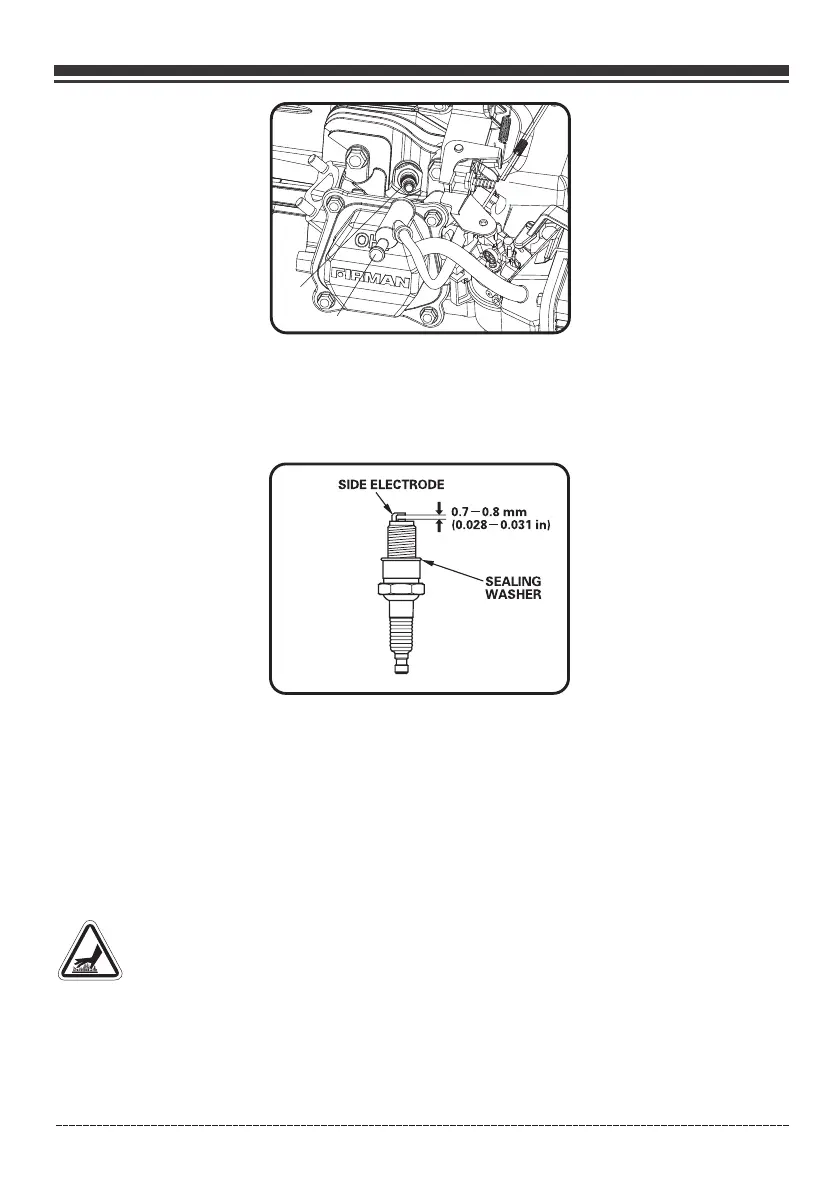 (d) Adjust the electrode gap to 0.7 to 0.8 mm (0.028” to 0.031”).