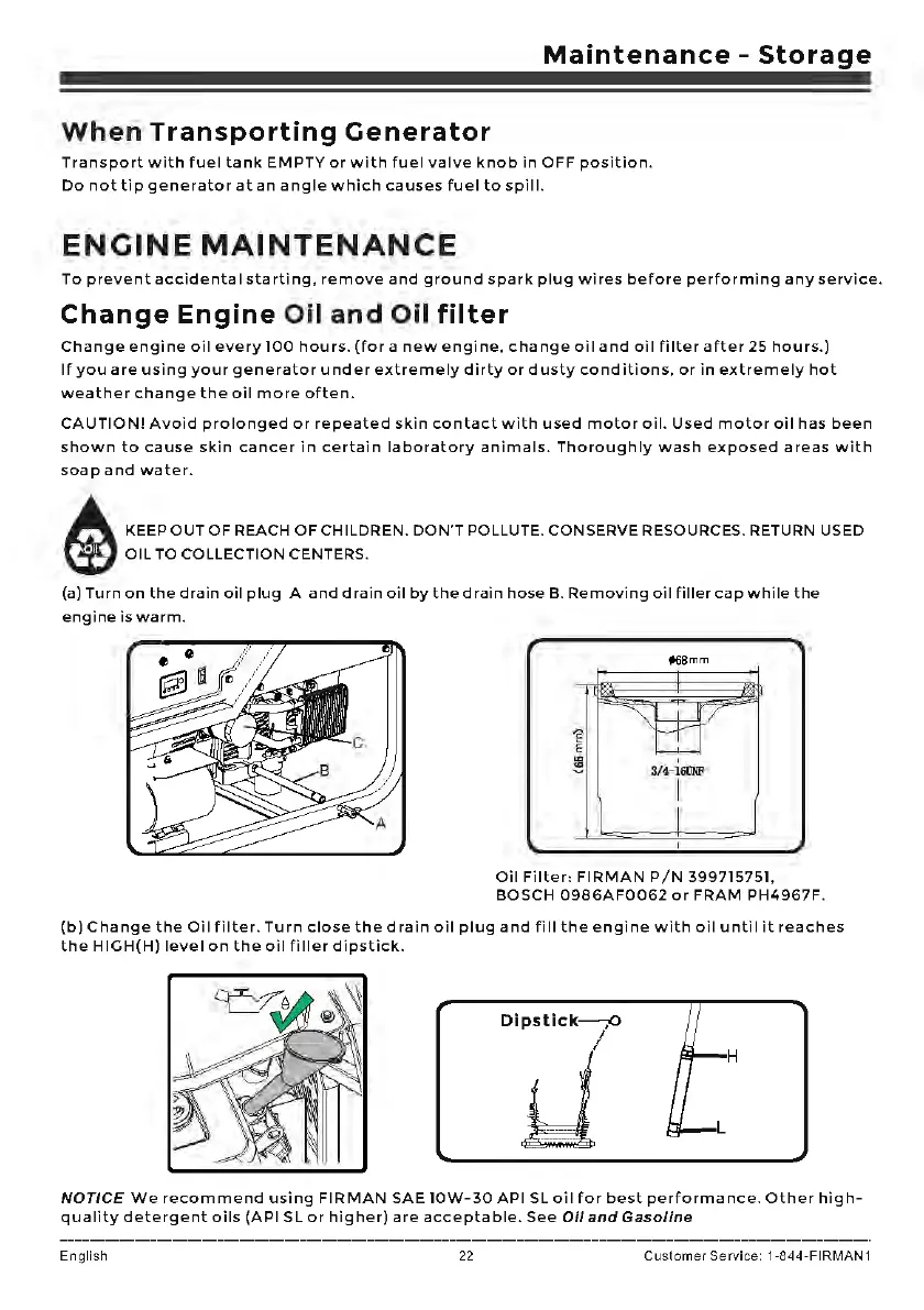 NOTICE We recommend using FIRMAN SAE l0W-30 API SL oil for best performance. Other high-