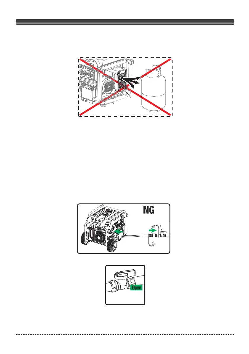 Connect the NG hose to both the NG source and portable generator LPG/NG Hose Connector (inlet).