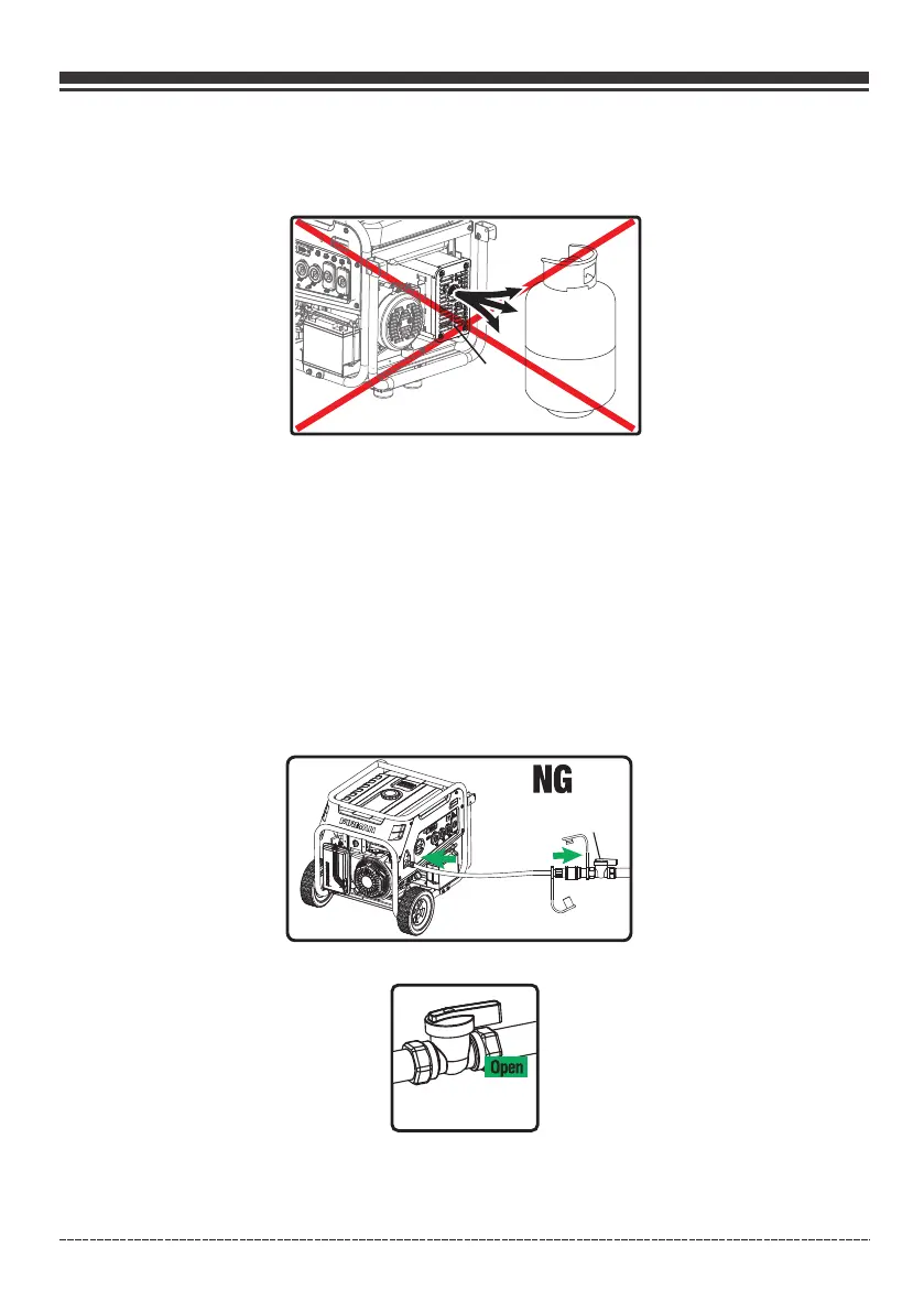 3. Connect the NG hose to both the NG source and portable generator LPG/NG Hose Connector (inlet).