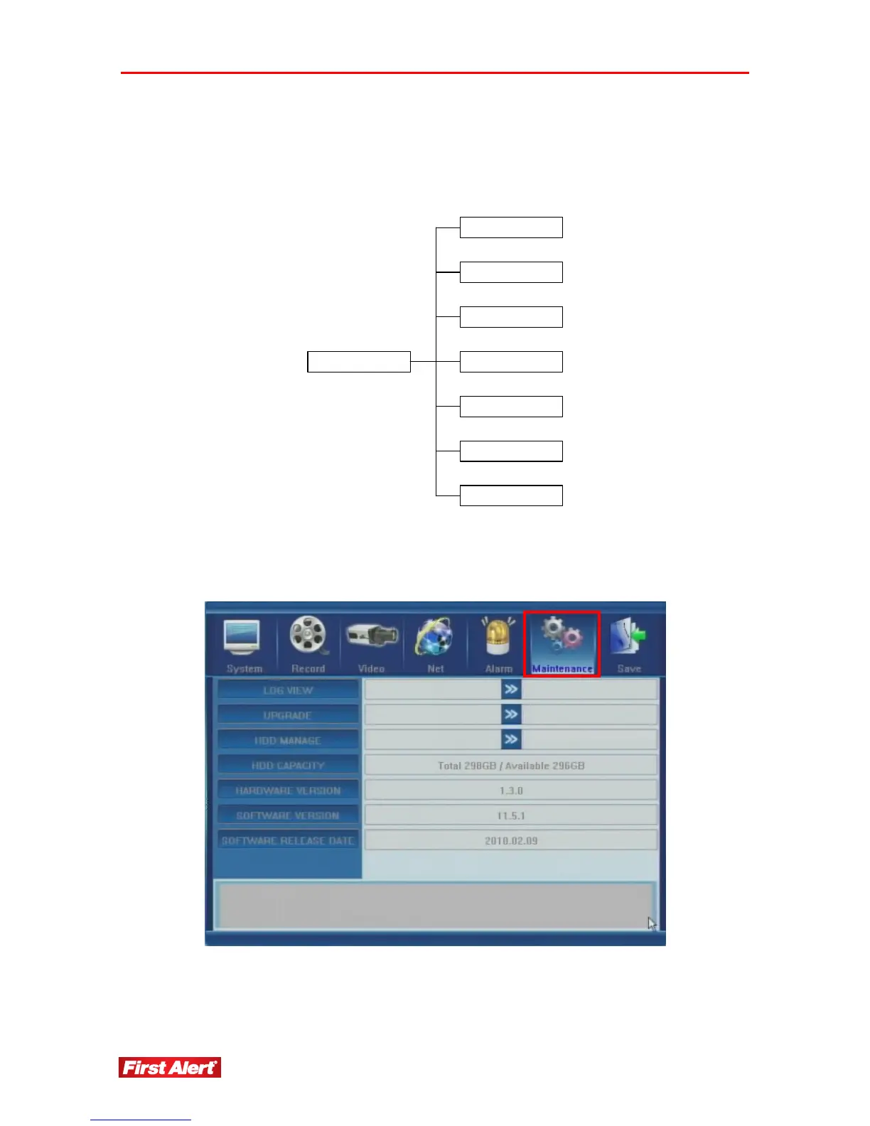 Maintenance sub-menu to view system and event logs, versions of software and hardware,