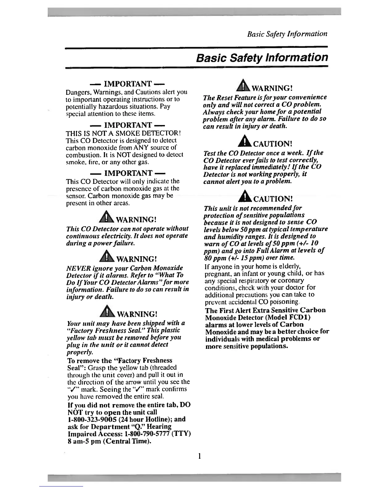 First Alert FCD2DD - Basic Safety Information; General Safety Warnings; Factory Freshness Seal; Sensitive Populations Advisory