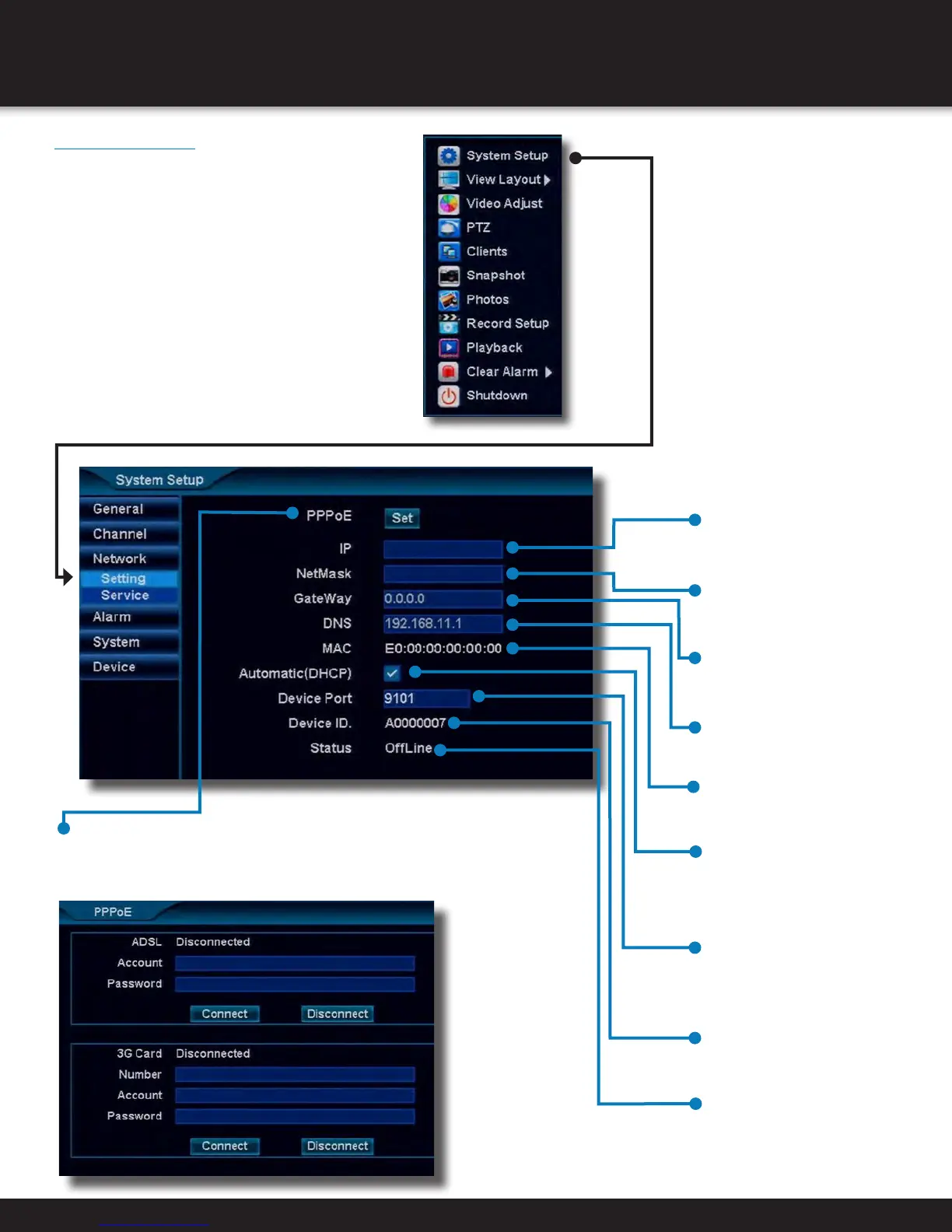 Using the Network menu, settings for the DVR’s