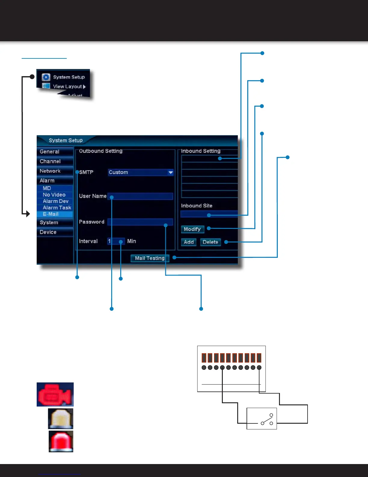 Adjust settings for E-Mail alarms, and destination