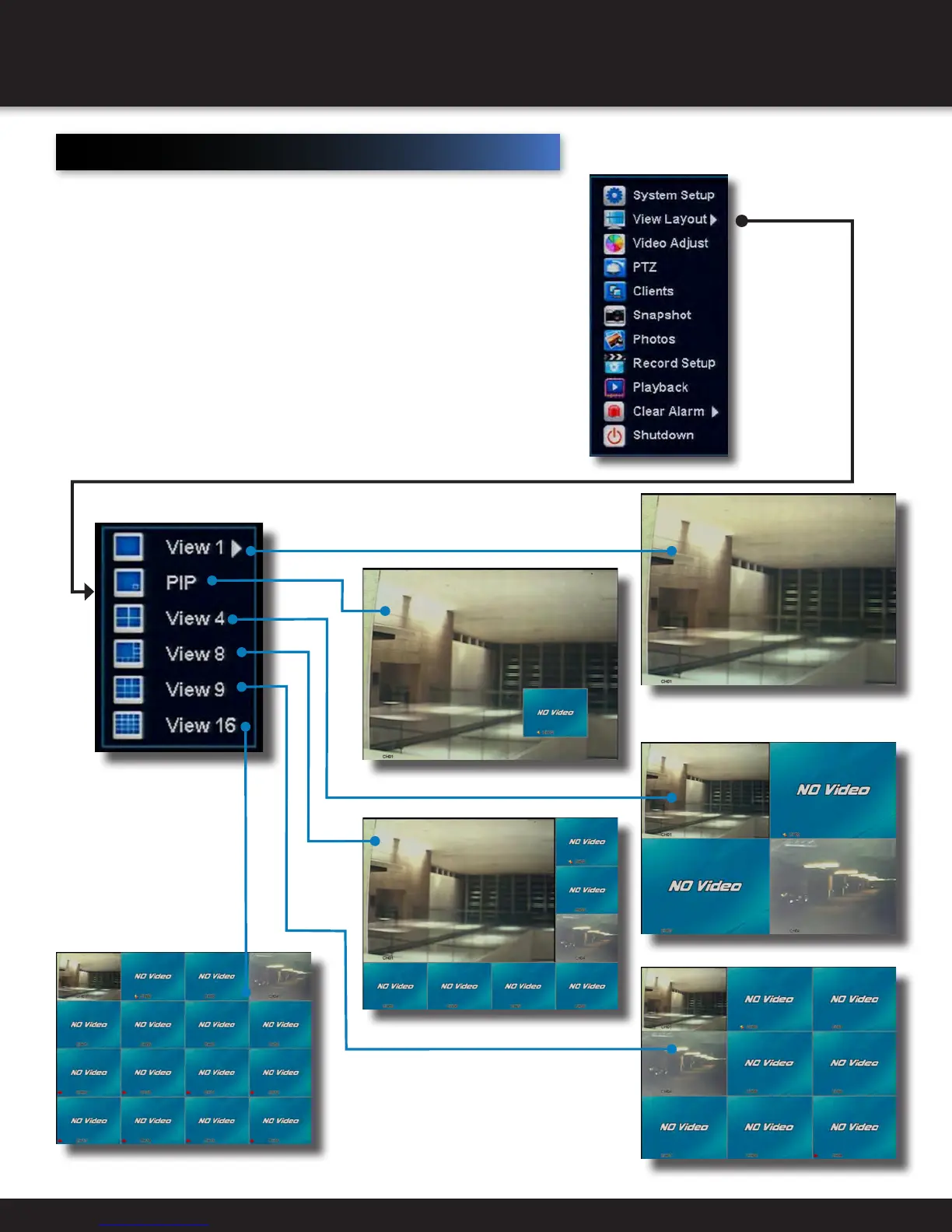 One camera channel can be selected to fill the whole display, or a number of