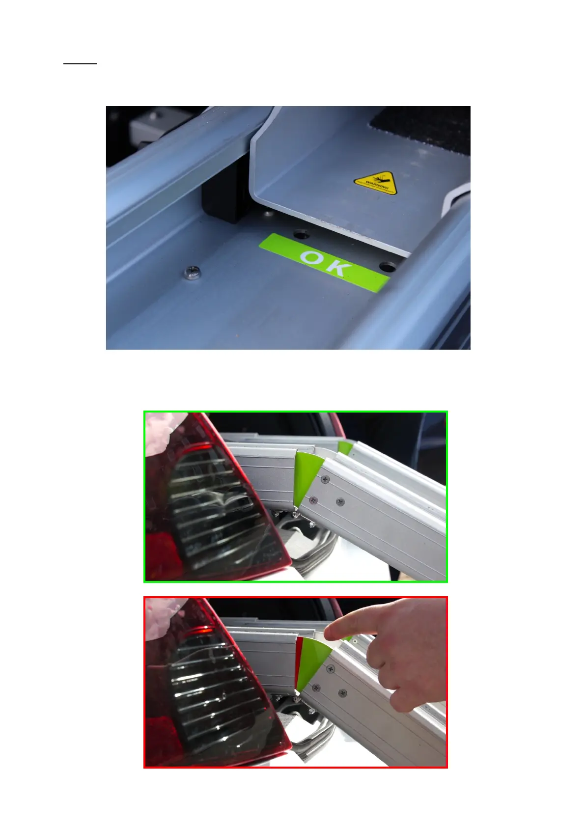 Photograph shows the OK label when the rails are fully extended, before lowering to the