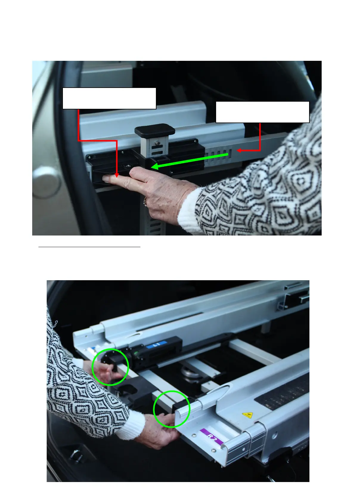 c) Slide the horizontal arms away, release the side push button and push the arm