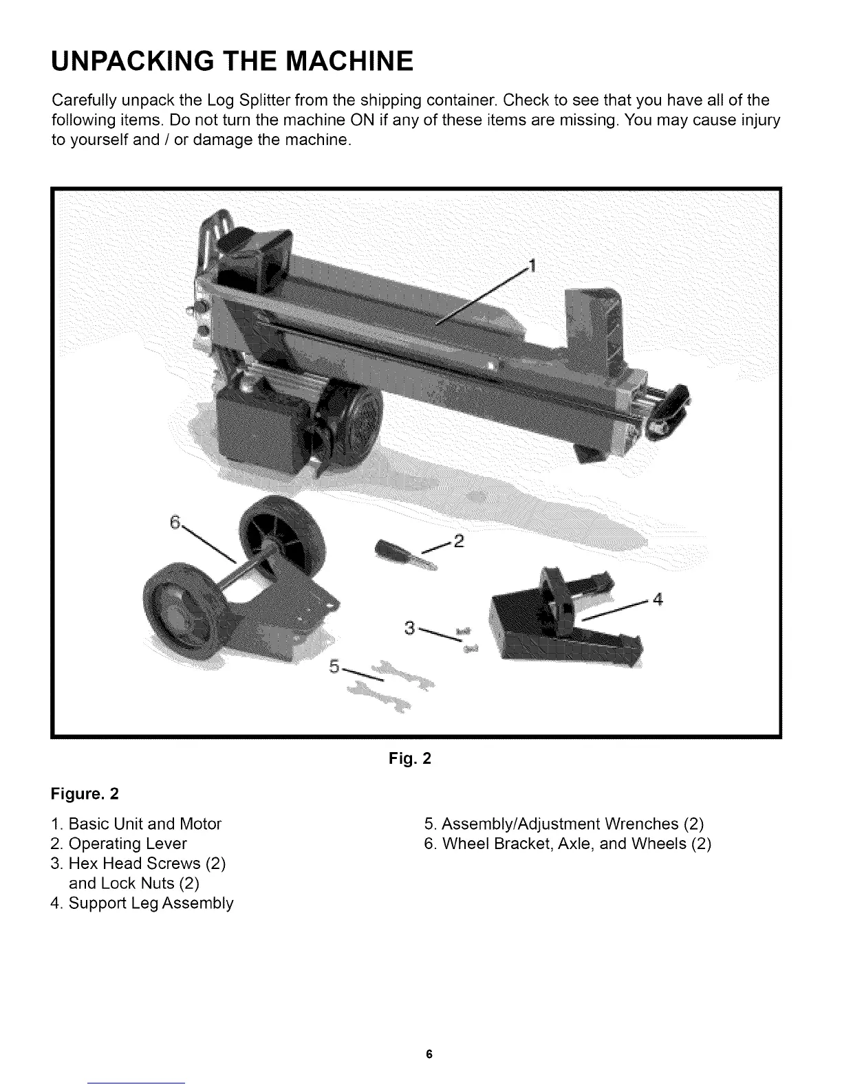 Carefully unpack the Log Splitter from the shipping container. Check to see that you have all of the