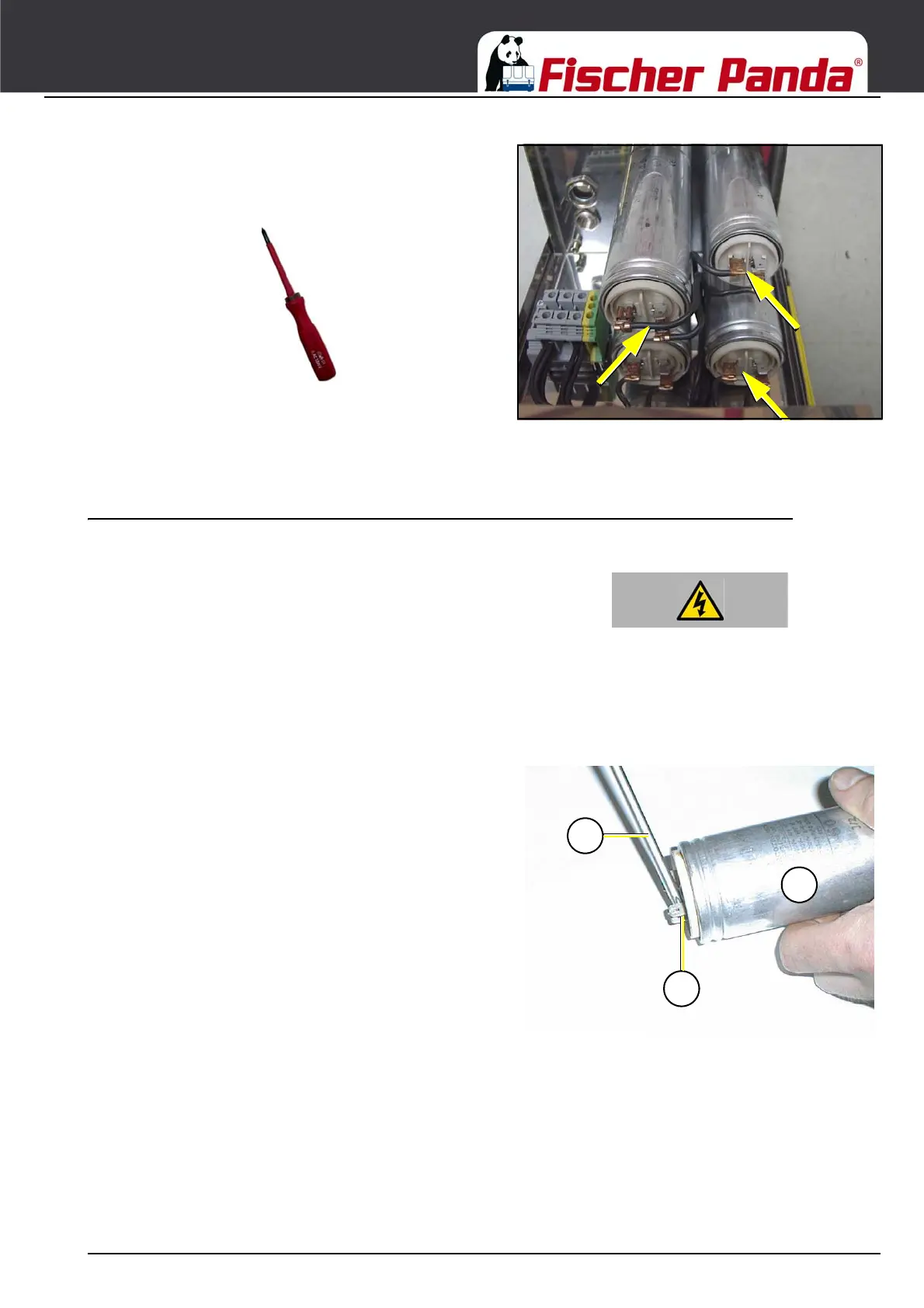 removed, the capacitors must discharged by bridging the capacitor terminals together with a slot screwdriver with an