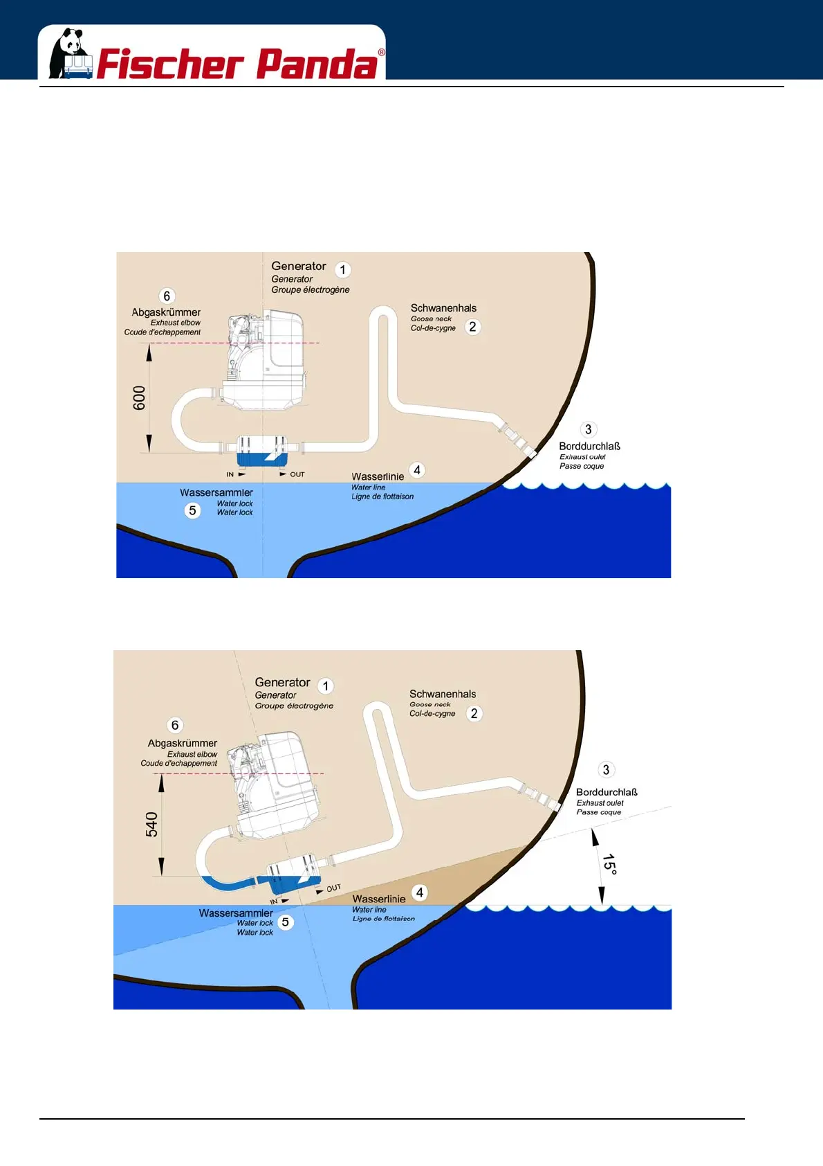 In Fig. 6.11.3.1-1, the waterlock is mounted in center underneath the generator. When the ship tilts, the position of