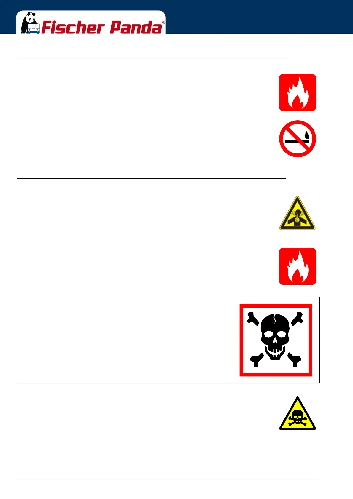 Do not smoke and avoid naked flame and sparking near fuels and the generator. Fuel is highly