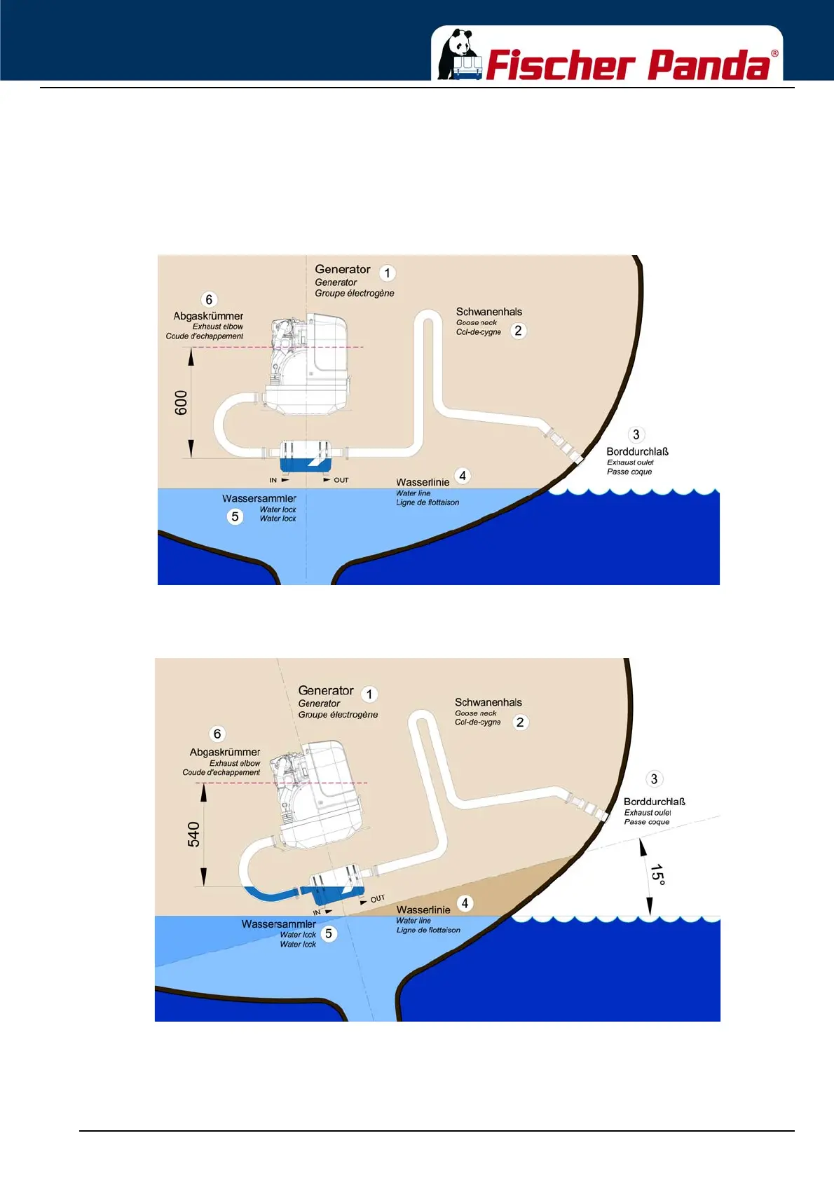 In Fig. 6.11.3.1-1, the waterlock is mounted in center underneath the generator. When the ship tilts, the position of