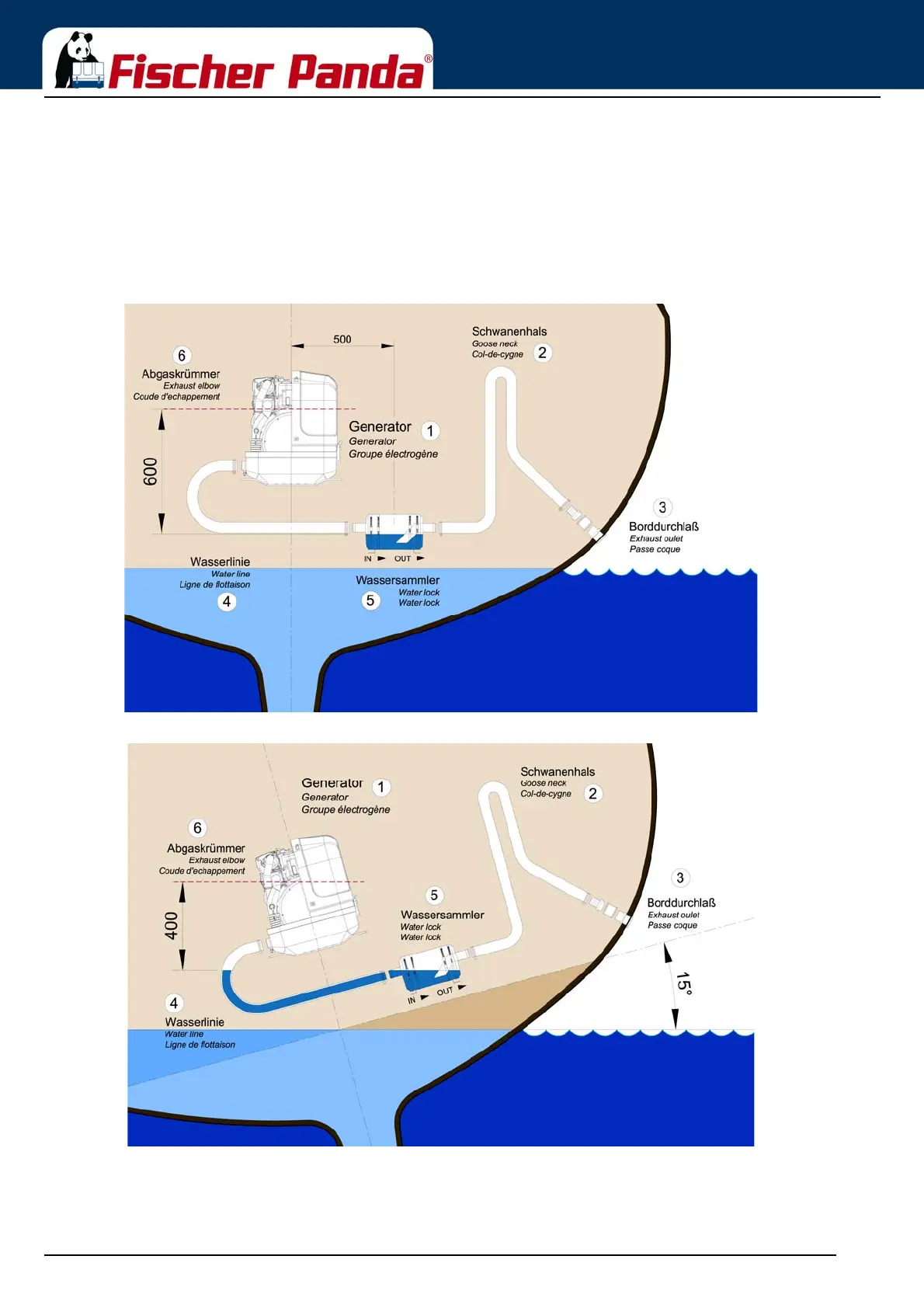 The following pictures are primarily relevant for an installation of the generator with the waterlock on sailing yachts.