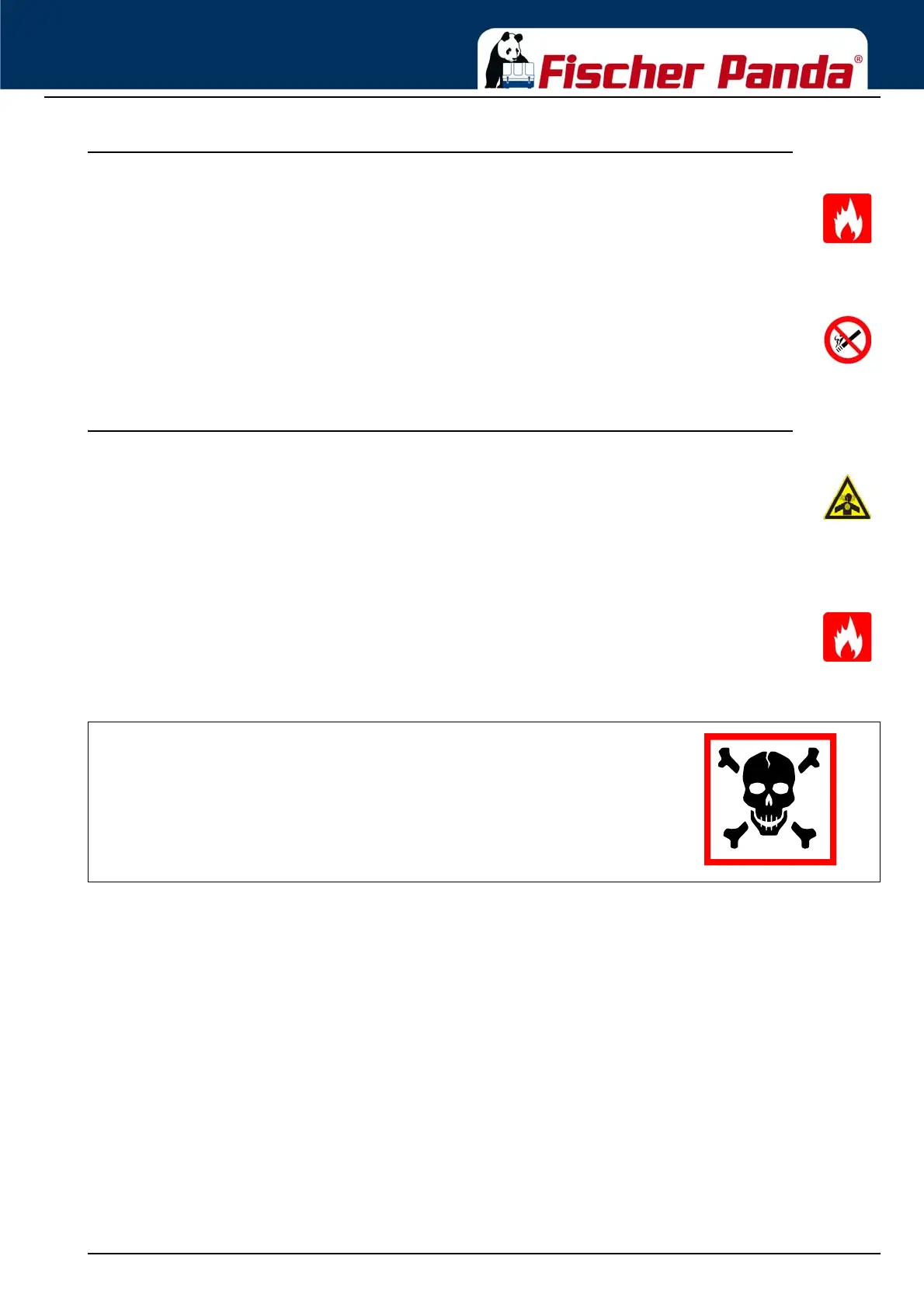 Do not smoke and avoid naked flame and sparking near fuels and the generator. Fuel is highly flammable
