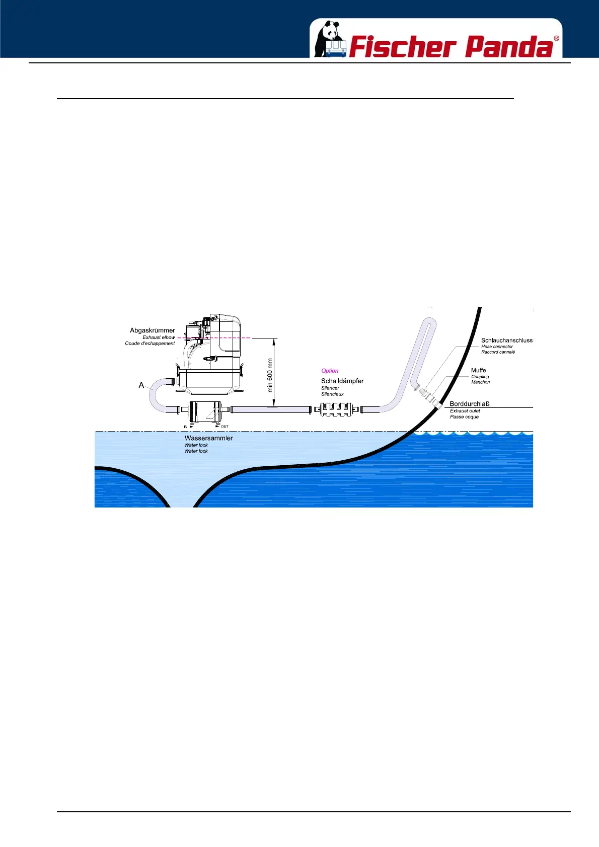 hull outlet. For such long exhaust routes, the exhaust hose diameter should also be increased, f.e. from NW40mm to