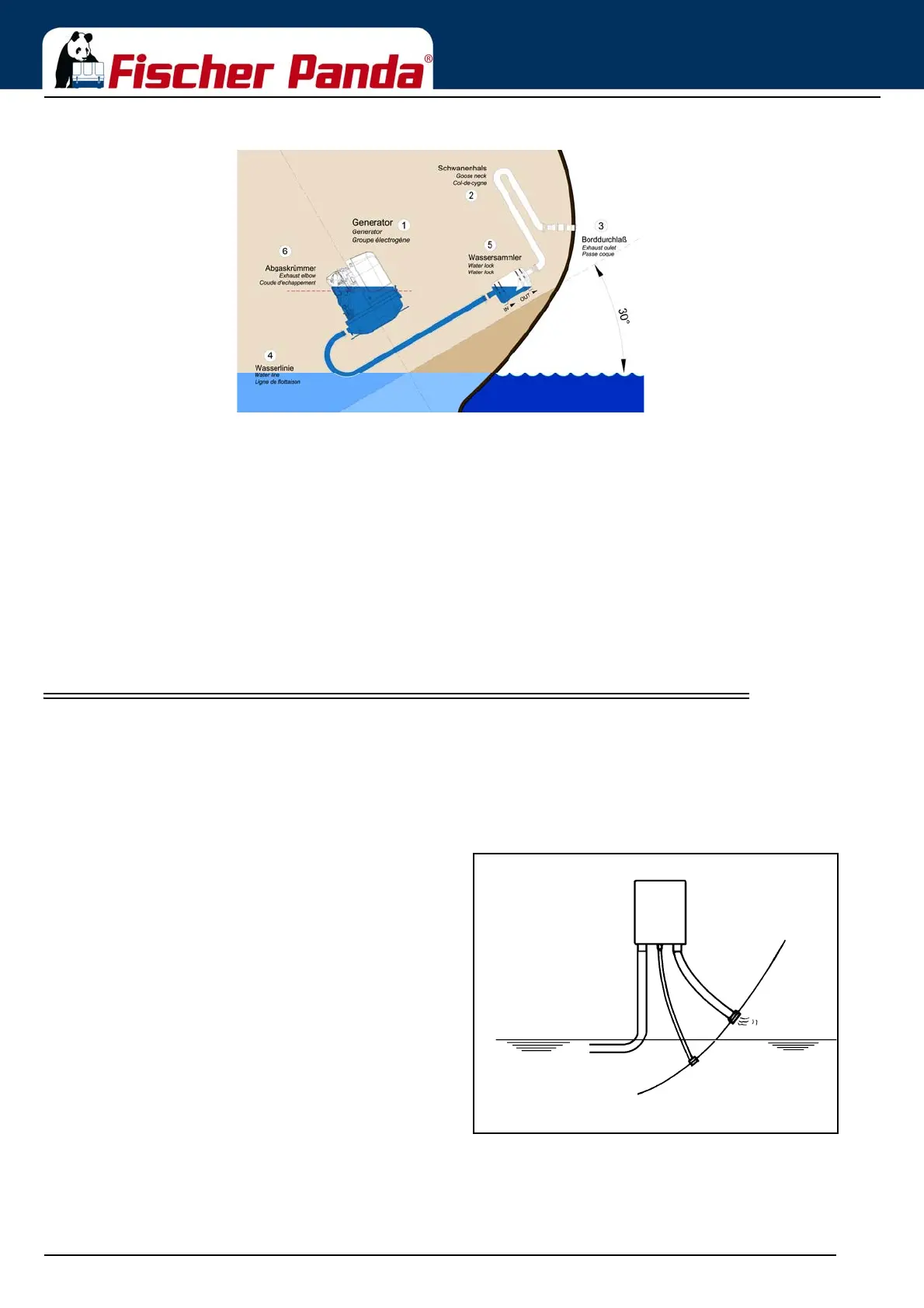 „exhaust goose neck“, and water separator. With this „exhaust/water separator“ the cooling water is derived over a