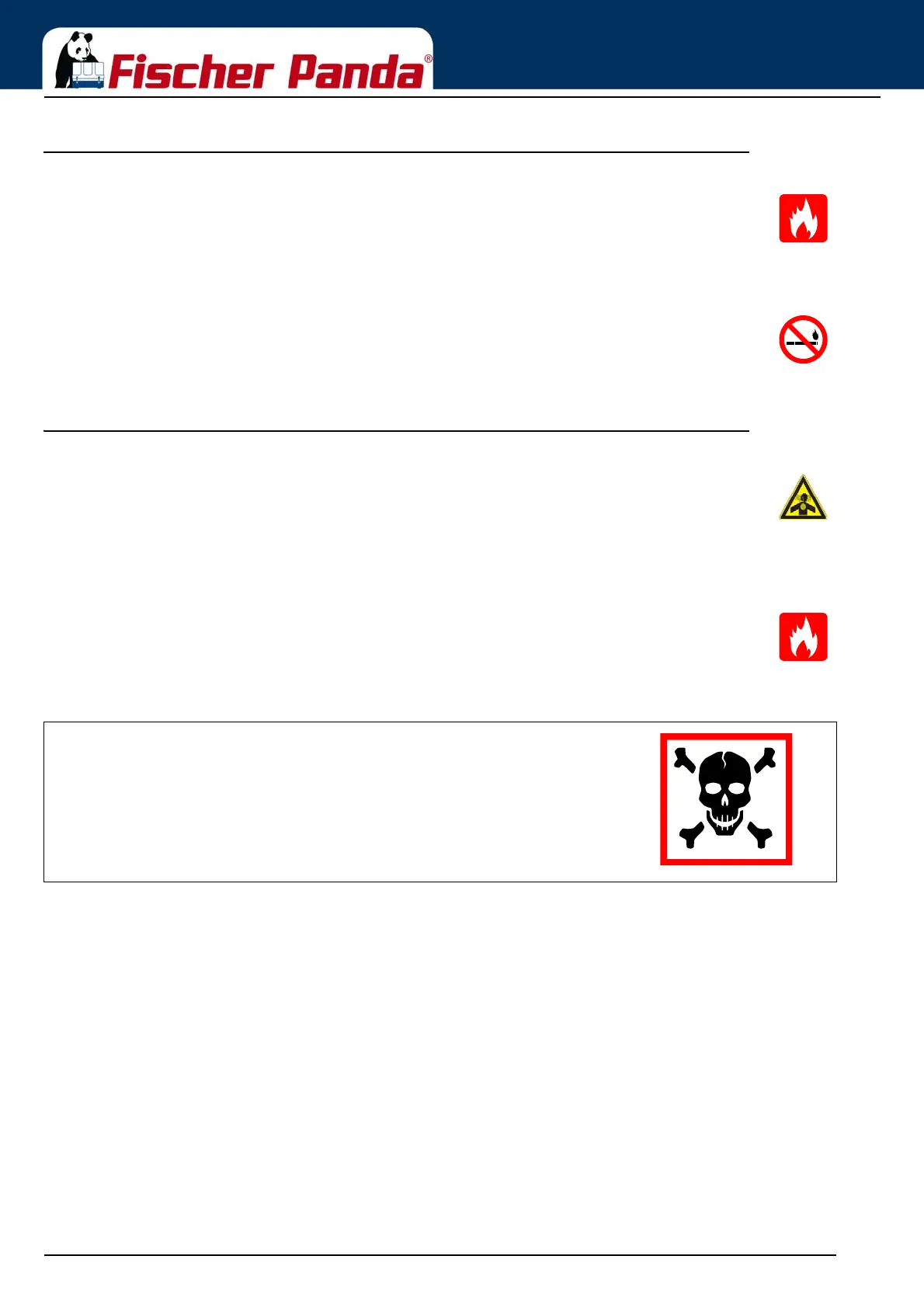Do not smoke and avoid naked flame and sparking near fuels and the generator. Fuel is highly flammable