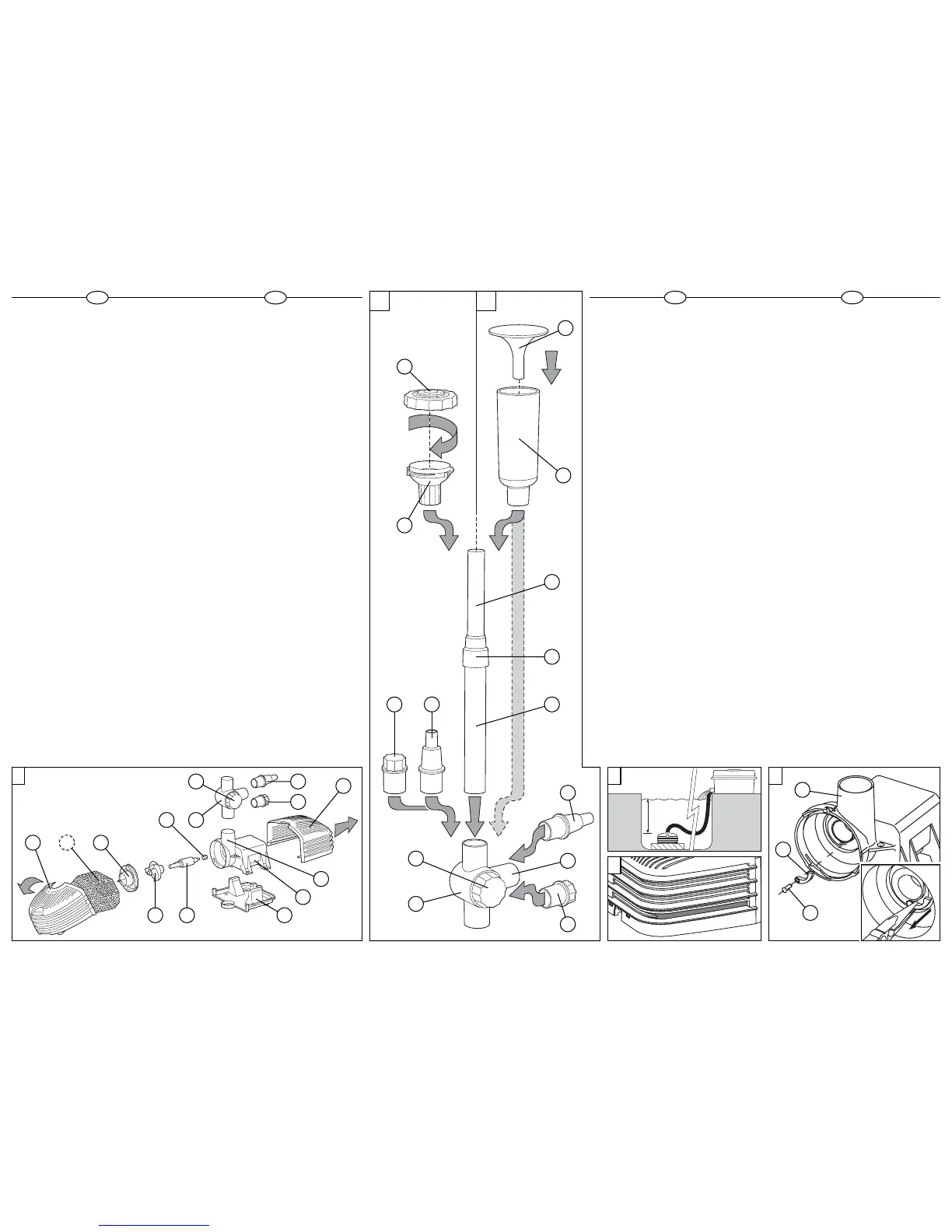 n°3 montre une installation classique avec filtre et chûte d’eau.