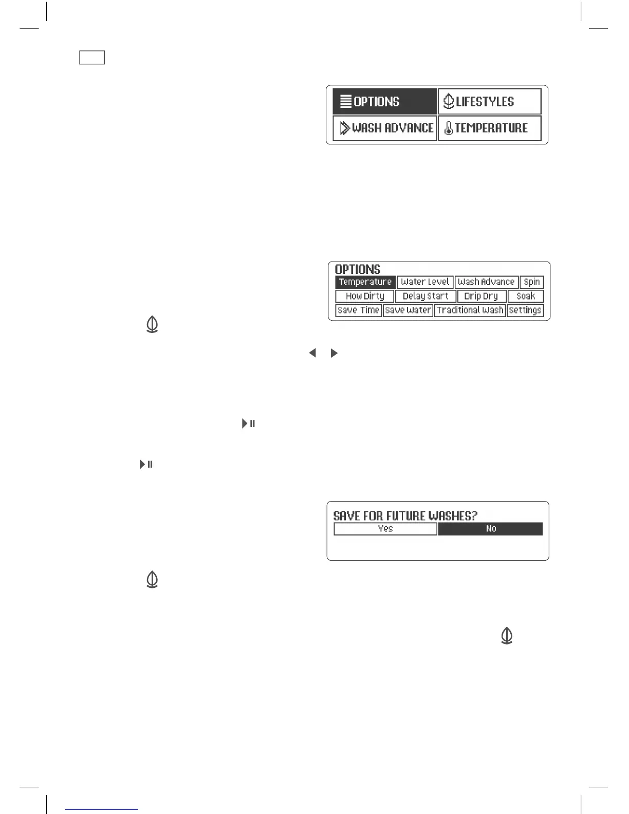 TEMPERATURE – allows you to select the temperature of your Eco Active™ or traditional wash