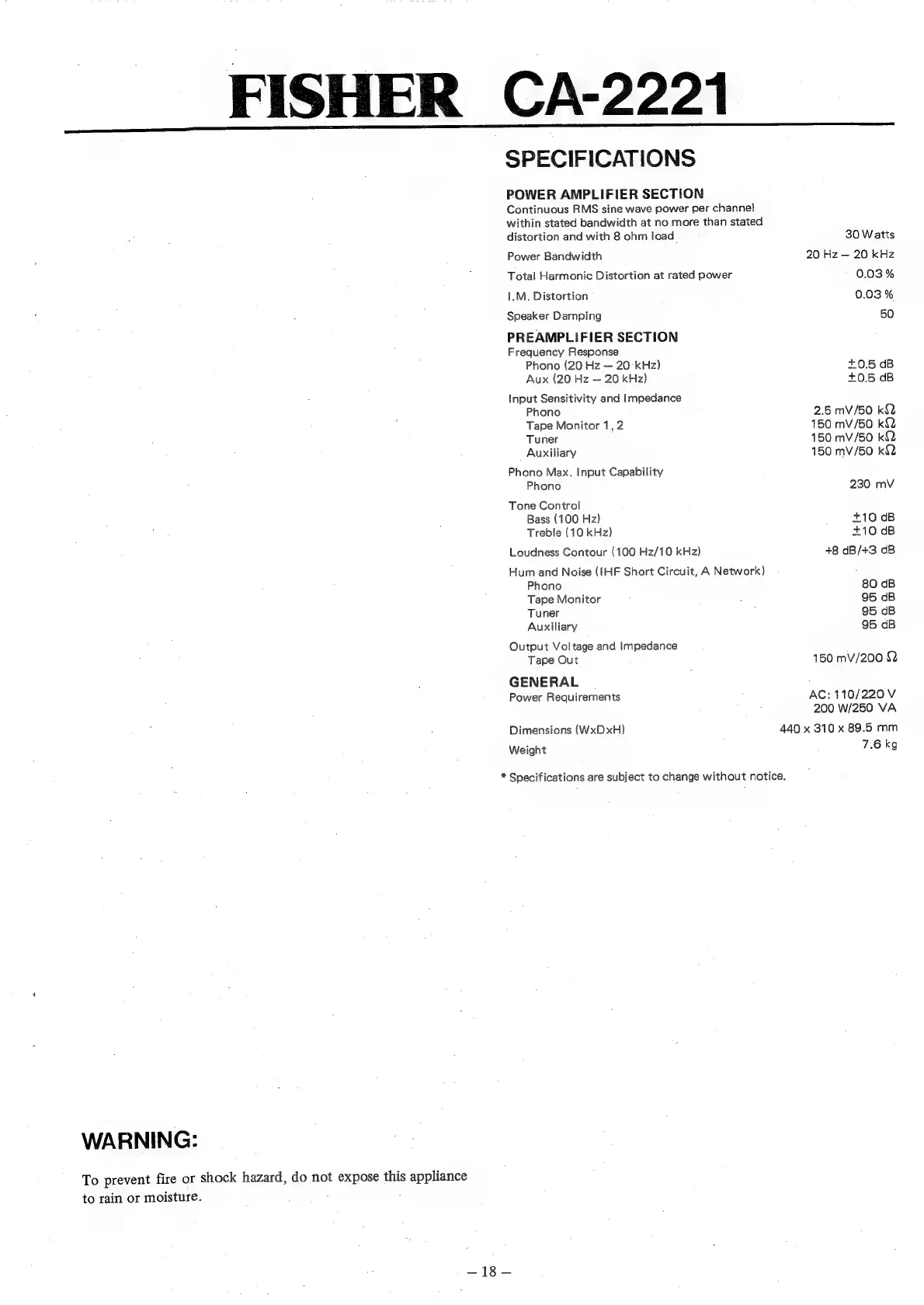 Fisher CA-2221 - SPECIFICATIONS; POWER AMPLIFIER SECTION; PREAMPLIFIER SECTION