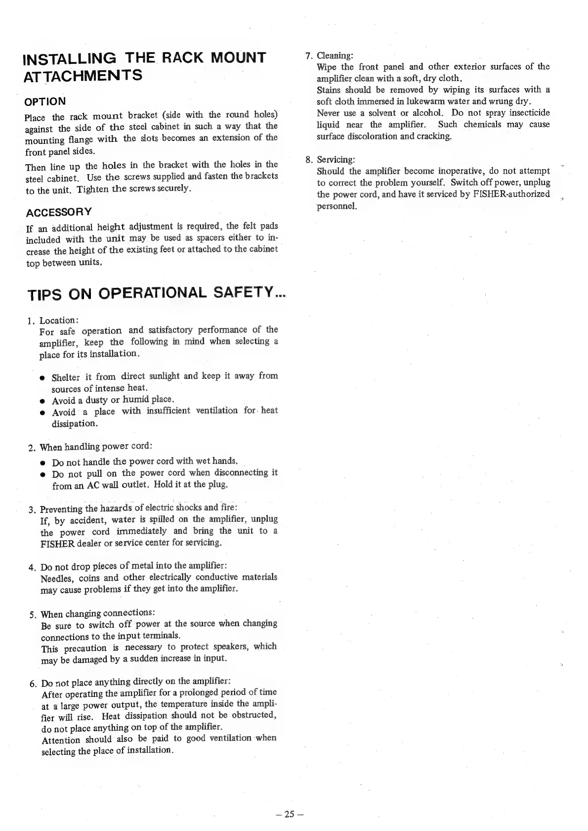 Fisher CA-2221 - TIPS ON OPERATIONAL SAFETY; Location:; When handling power cord:; Preventing the hazards of electric shocks and fire: