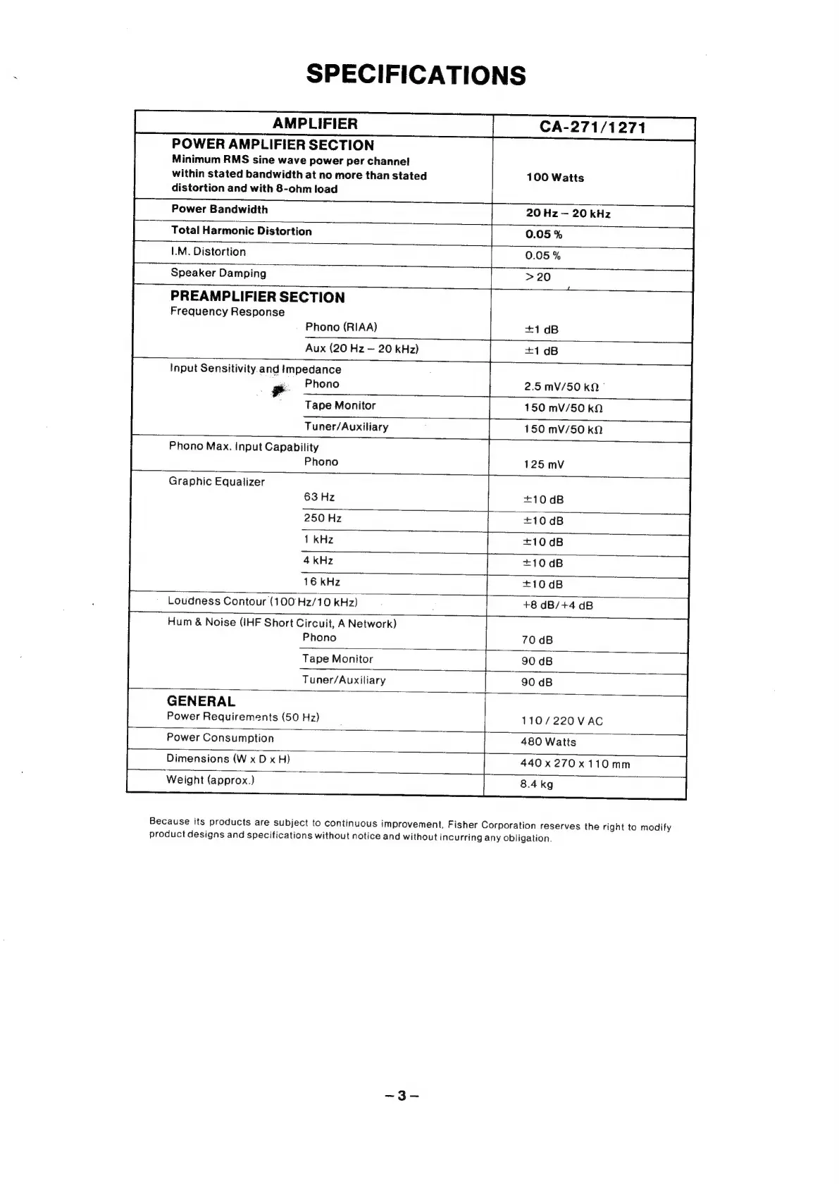 Fisher CA-271 - Specifications