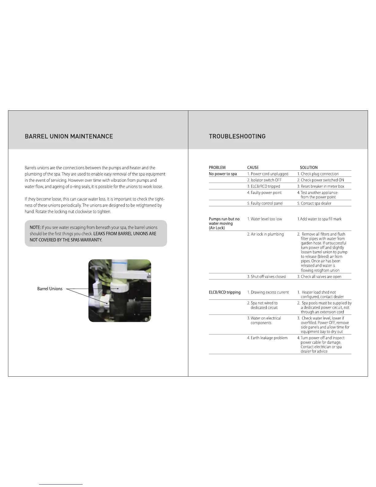 Fisherspas Fisher Five+ - Troubleshooting; No Power to Spa; Pumps Run But No Water Moving (Air Lock); ELCB;RCD Tripping