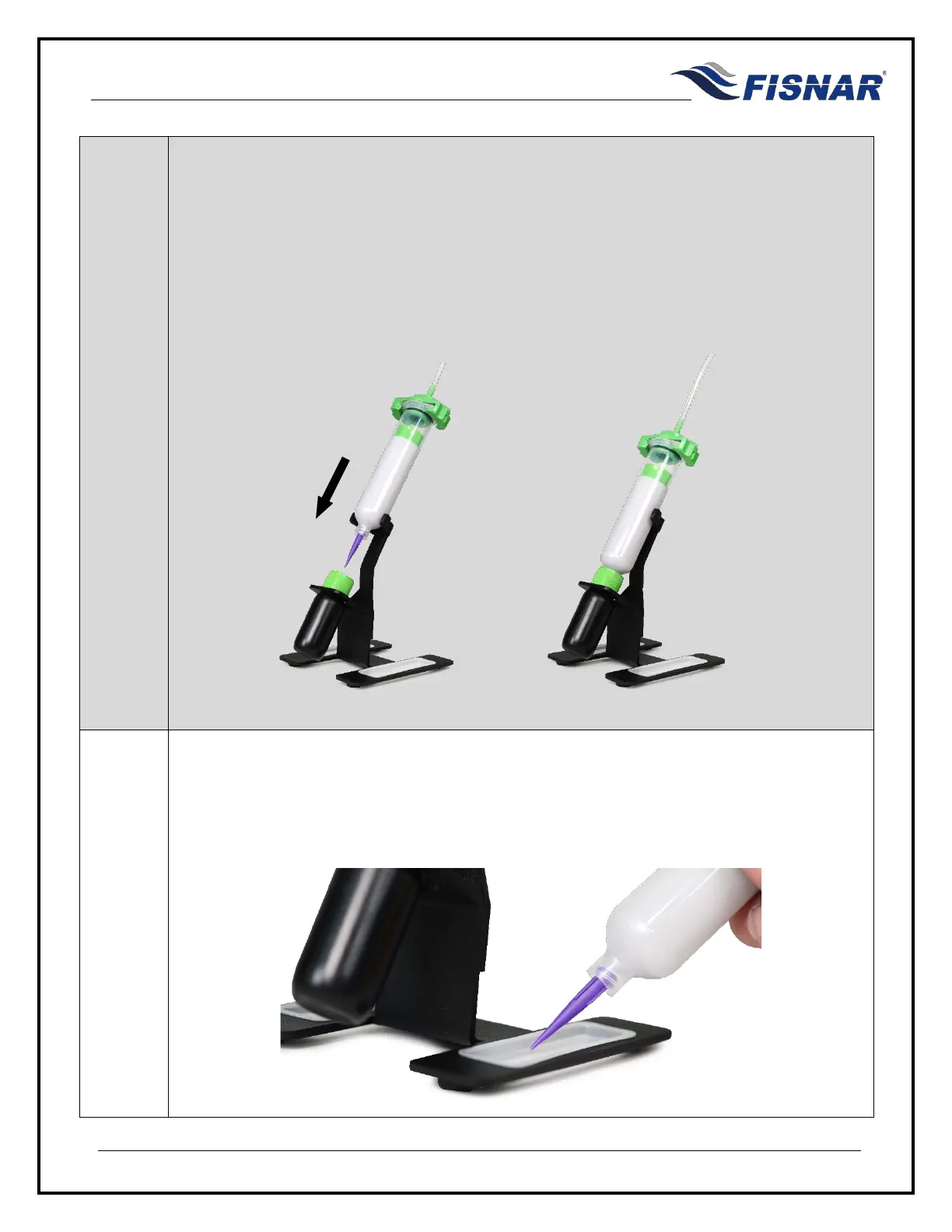 Purge trays are provided with the syringe stand to allow for a small amount of fluid to be