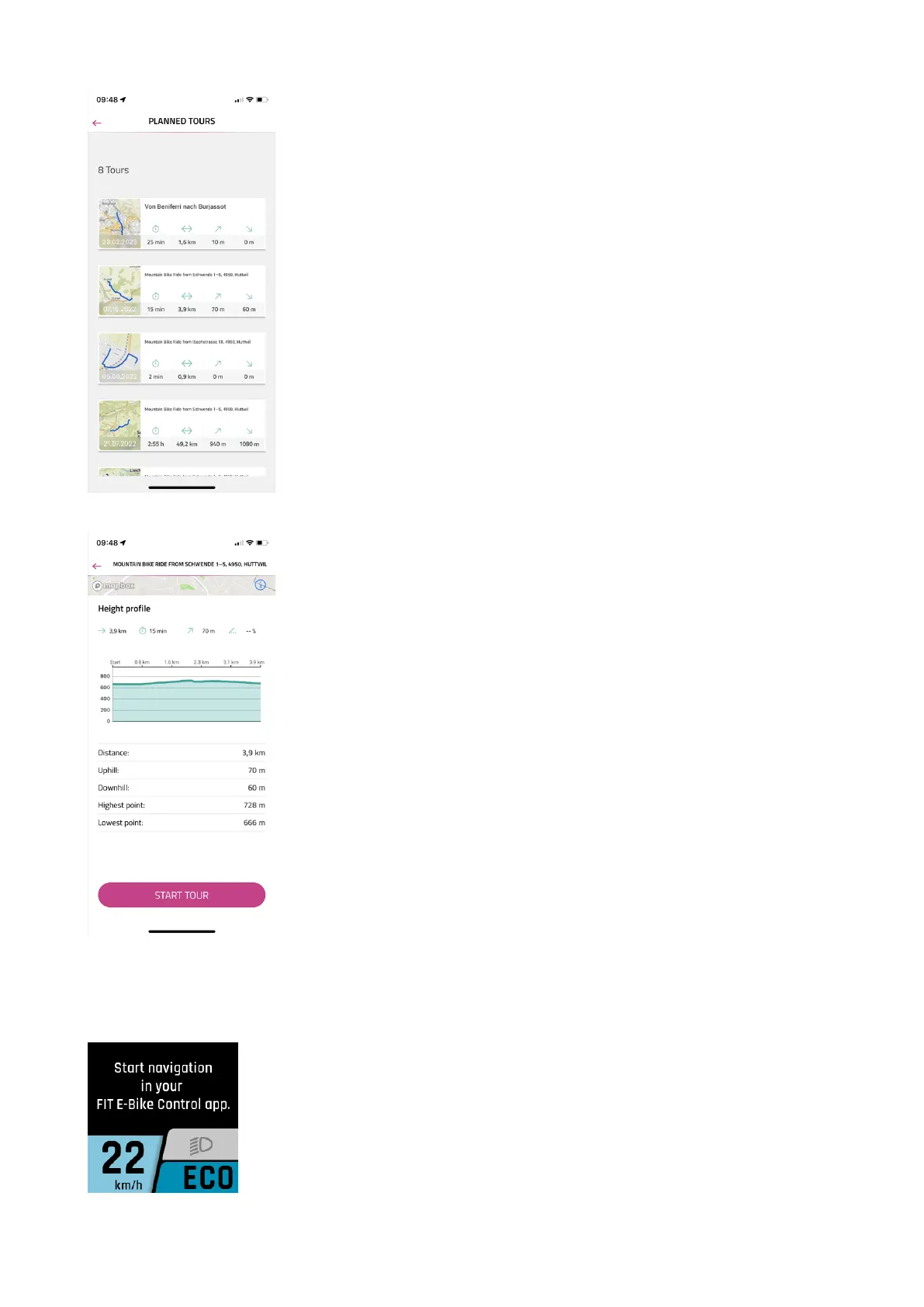 The PLANNED TOURS menu displays the planned tours of the linked komoot account