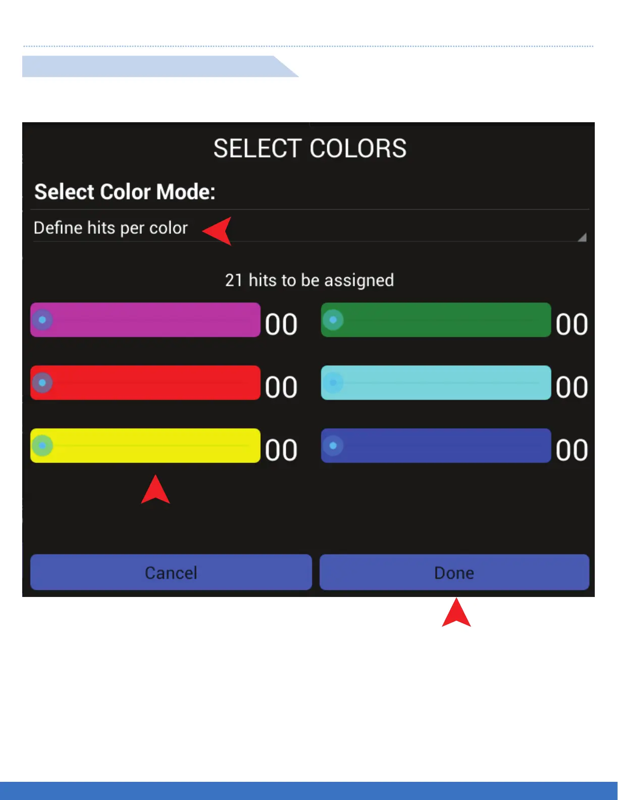 1. Select “Define hits per colour” and a new menu screen will appear for the selection of hits per colour.