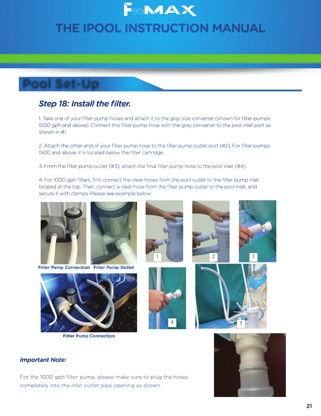1500 gph and above). Connect this filter pump hose with the gray converter to the pool inlet port as