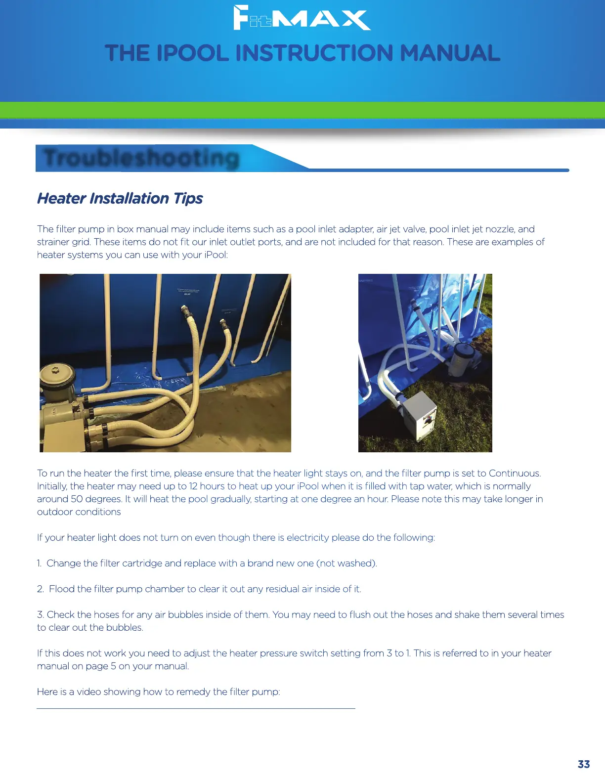 To run the heater the first time, please ensure that the heater light stays on, and the filter pump is set to Continuous.