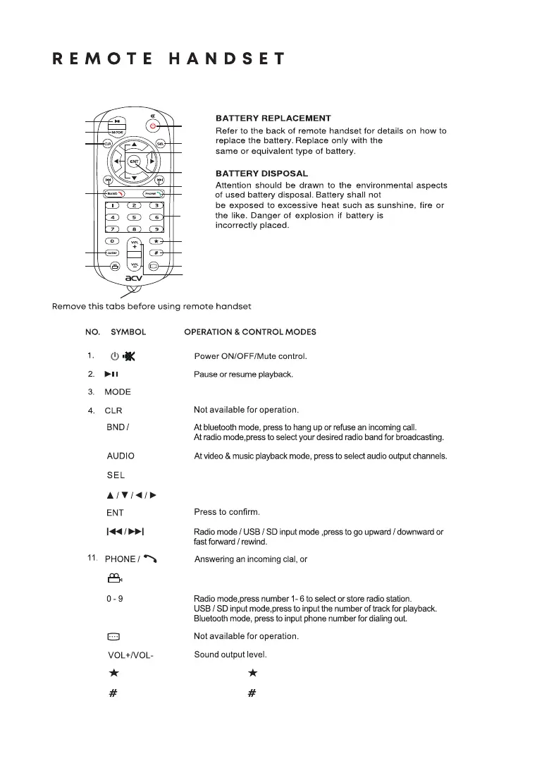 Five F720A - Remote Handset; Battery Information and Disposal; Control Modes and Functions